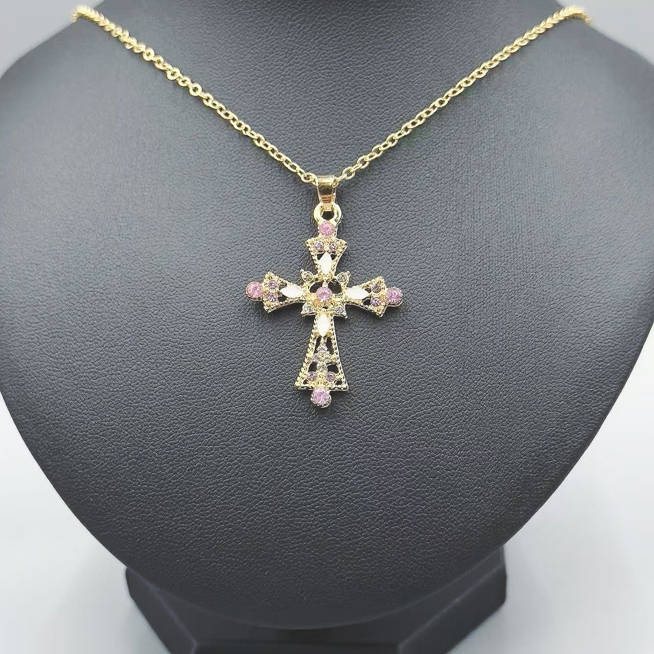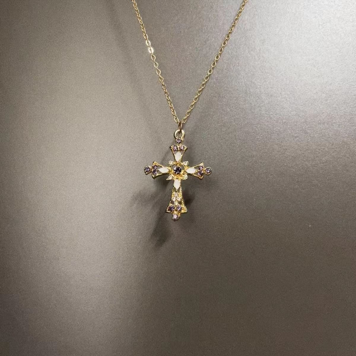 Vintage古着 Golden petal cross项链中古金色十字架长款锁骨链潮