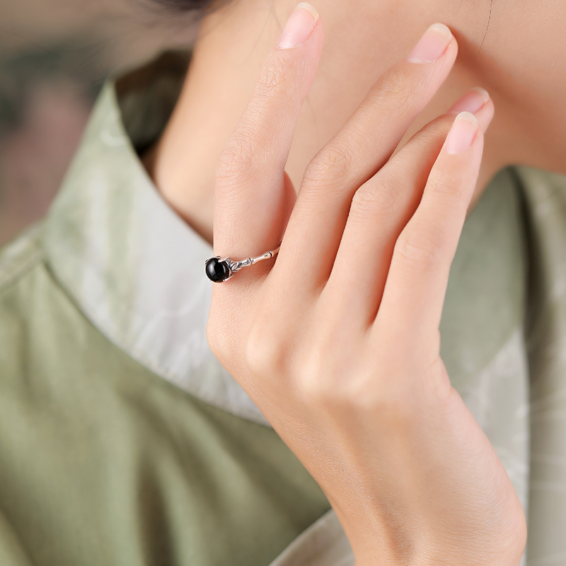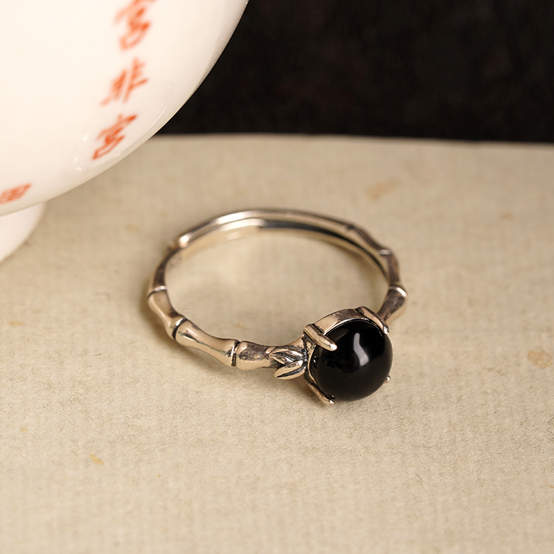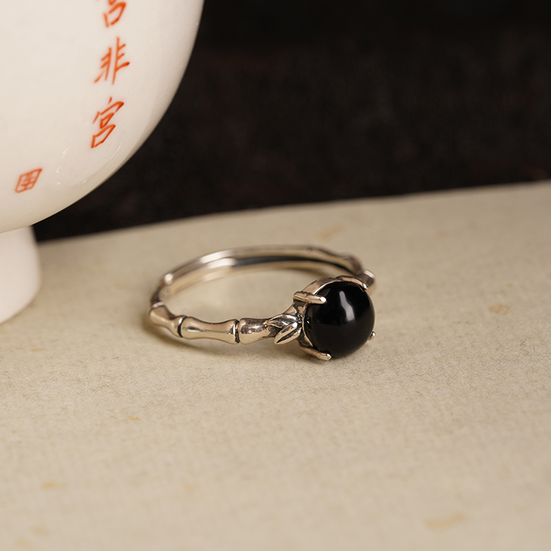 「墨竹」天然黑玛瑙蛋面竹节戒指女纯银黑曜石复古小众开口可调节