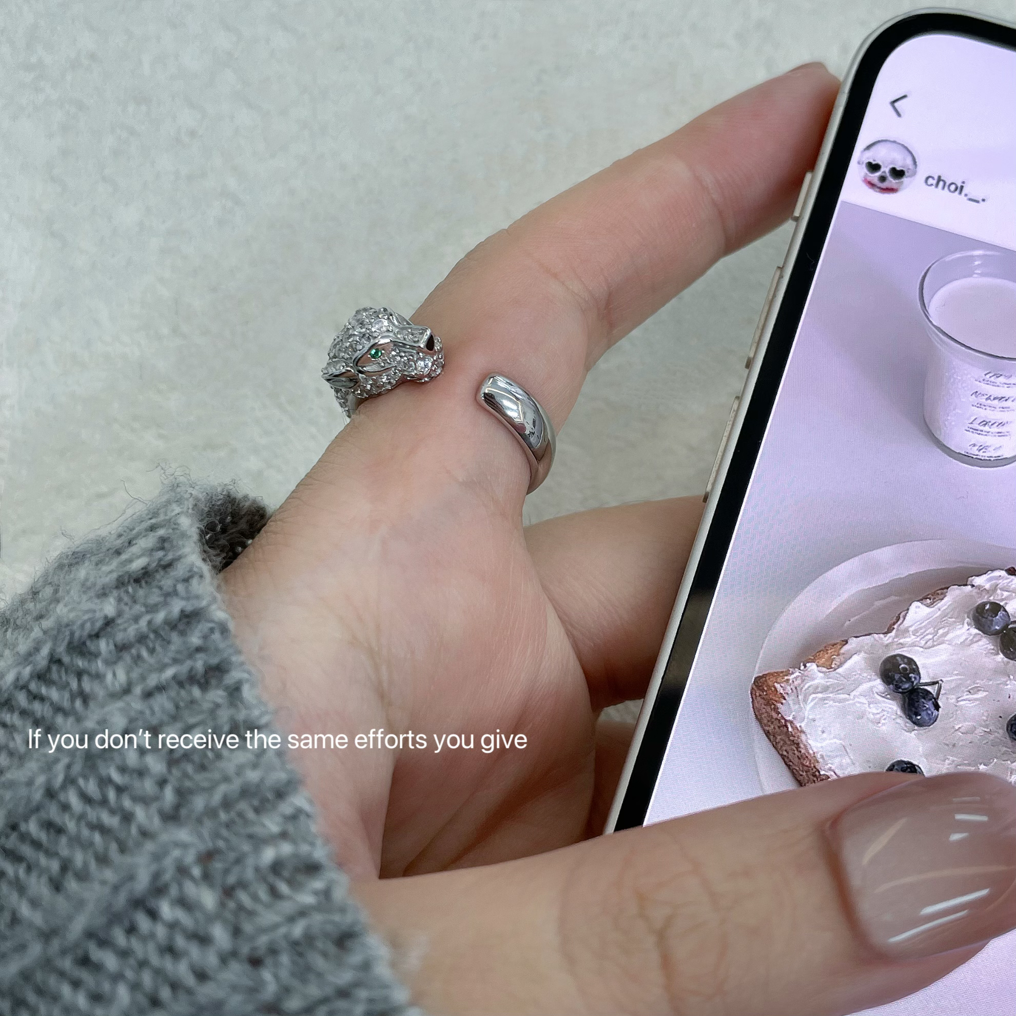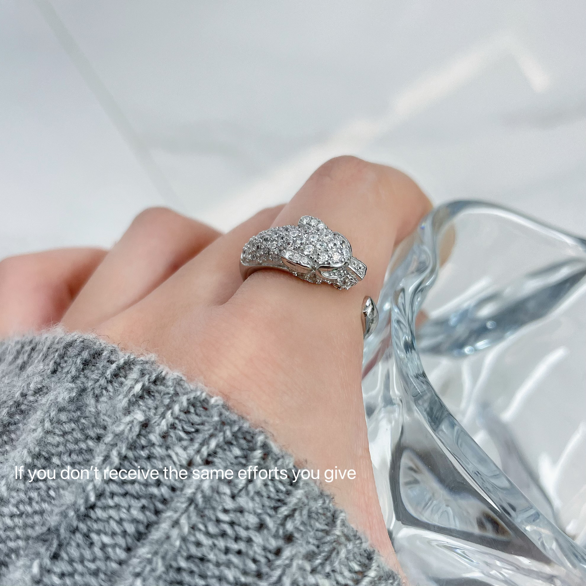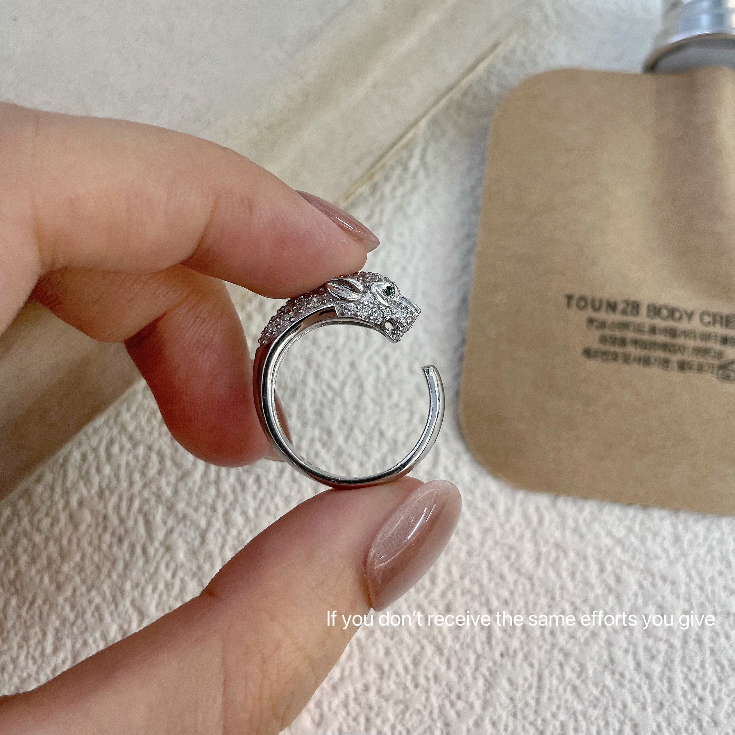 S925纯银宽版豹子头满钻戒指高端镶闪钻祖母绿眼猎豹食指环轻奢