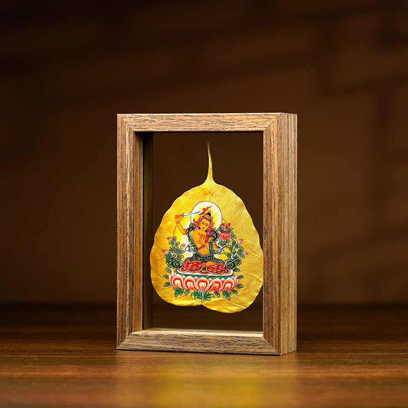 新非遗木质彩绘菩提叶摆台生肖黄财树叶标本可定图高透玻璃摆台