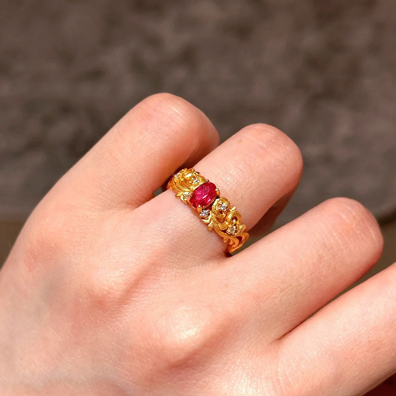 复古镂空雕花拉丝红刚玉戒指百搭镶钻红玫瑰之戒