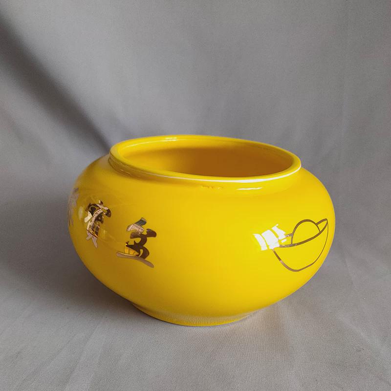黄色聚宝盆陶瓷罐子摆件无盖带盖都D有,招财进宝铜钱元宝图可绑绳