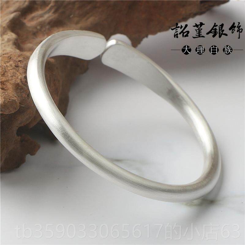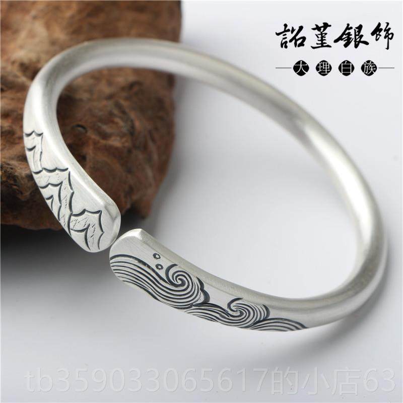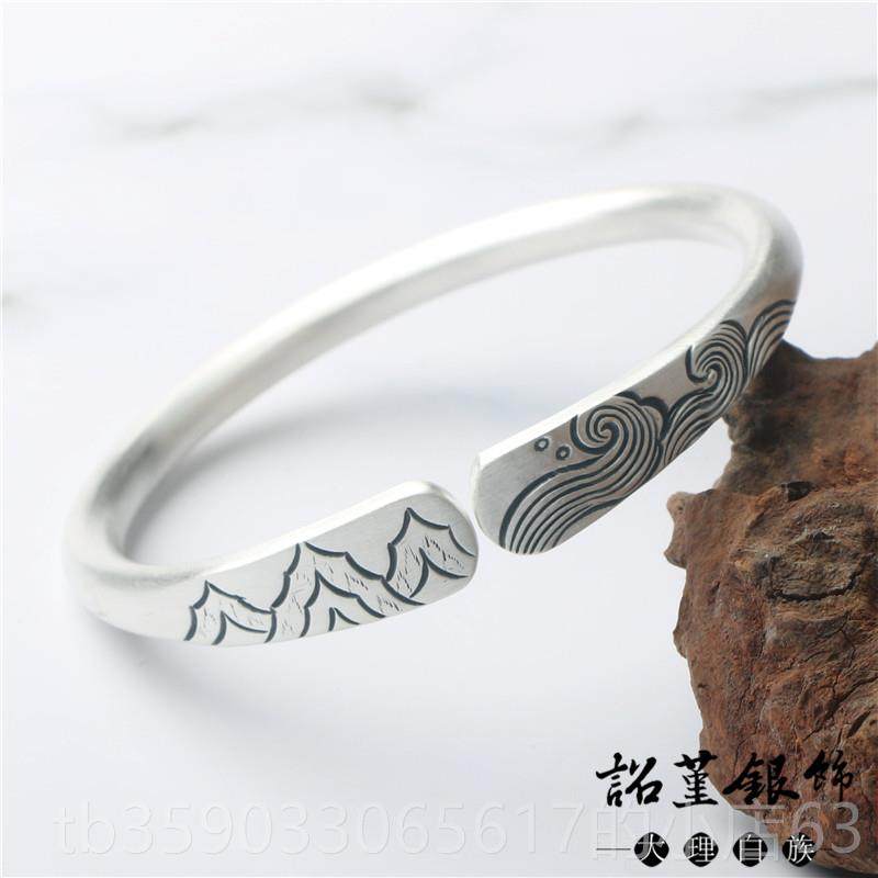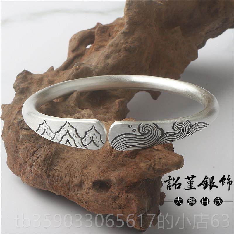 正品雪花足银999山海图案哑光复古风心开口实情侣银手款手镯女工