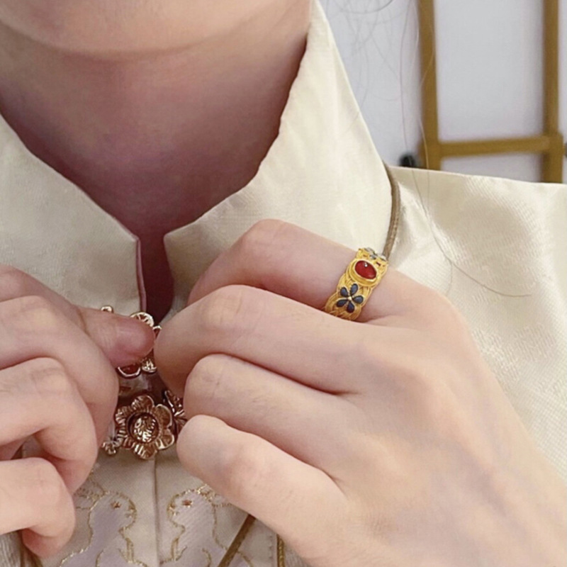 花丝龙凤华戒指女国风复古黄色珐琅指环新中式婚戒