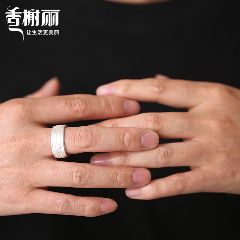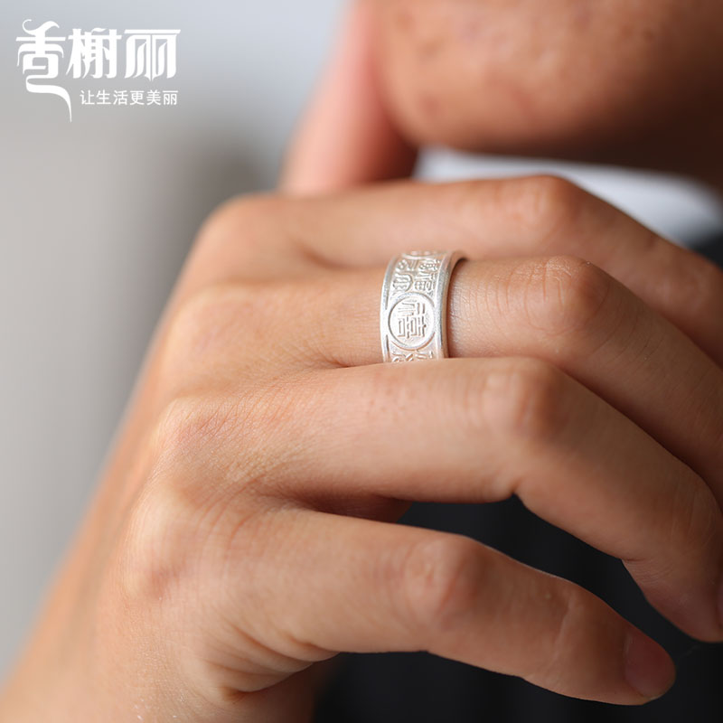 足银999福禄寿禧财可调活口戒指 大气男士食指指环银手饰免费刻字