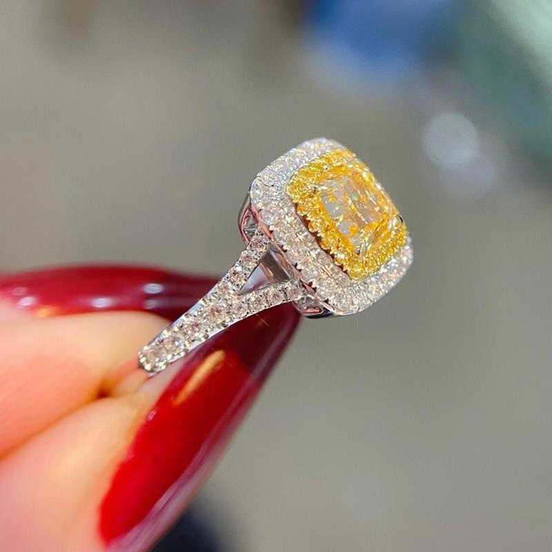 新款S925银微镶仿真钻公主少女系方形黄钻戒指气质百搭精美粉钻戒