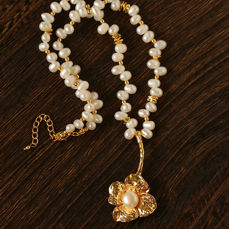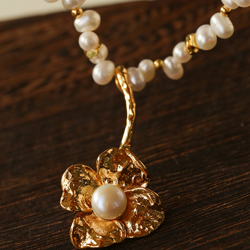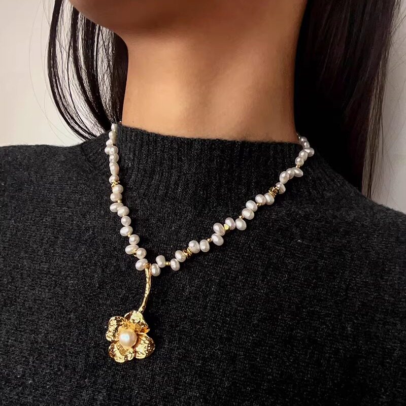 TU家法式复古轻奢天然珍珠金色花朵吊坠项链小众百搭毛衣链锁骨链