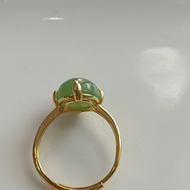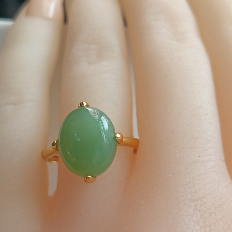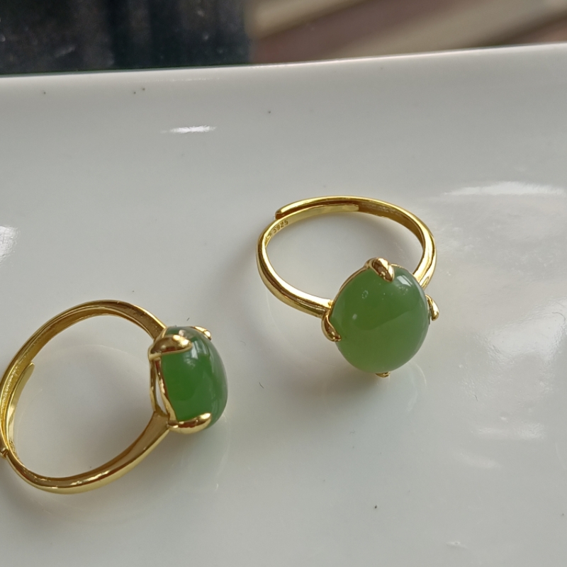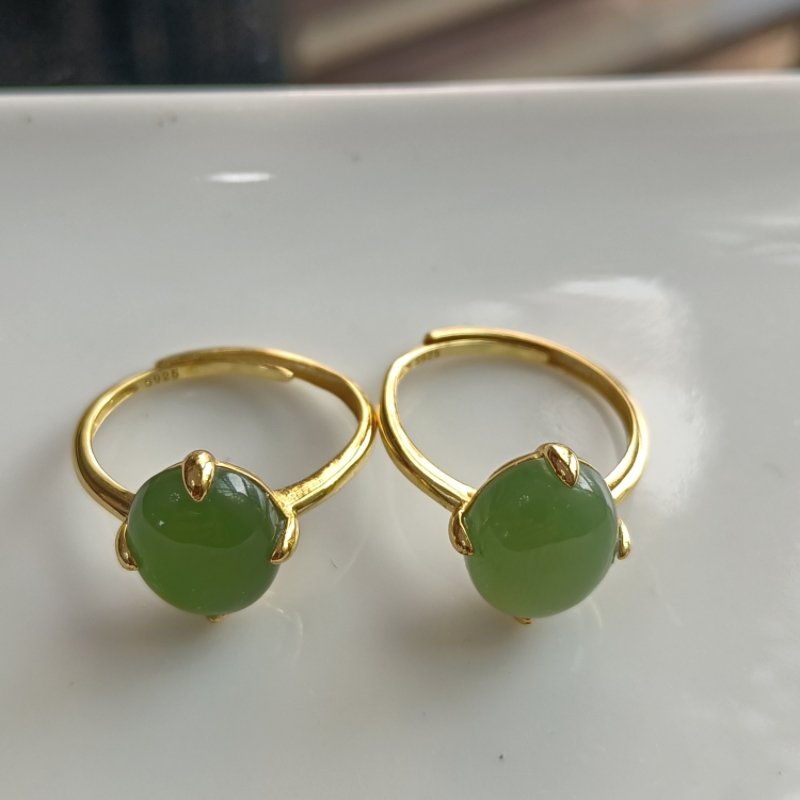 俄罗斯老坑碧玉和田玉戒指S925银镀金活口可调节女款带证书
