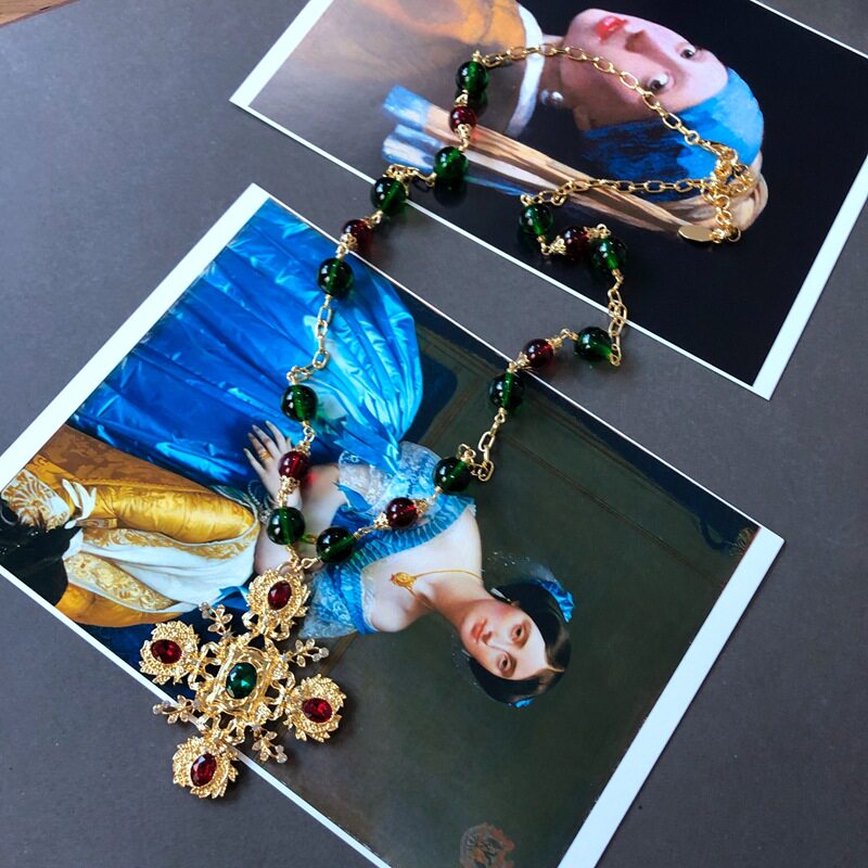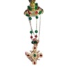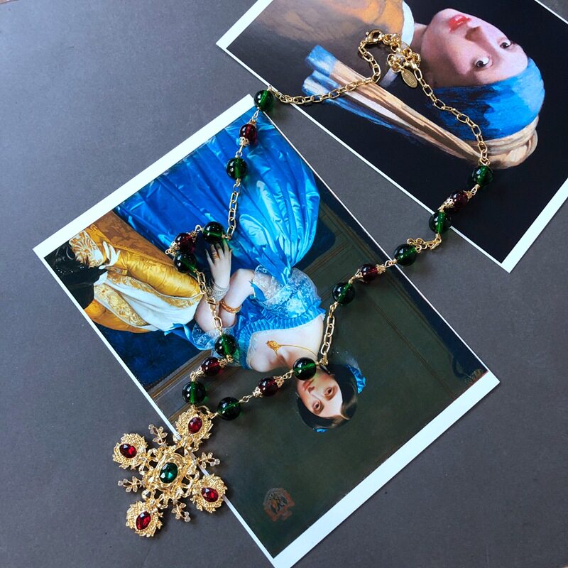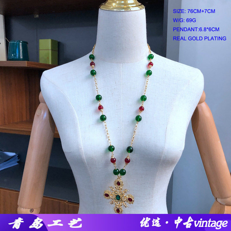 电镀真金古vintage红绿色琉璃圆珠优雅十字架形宝石钻毛衣链项链
