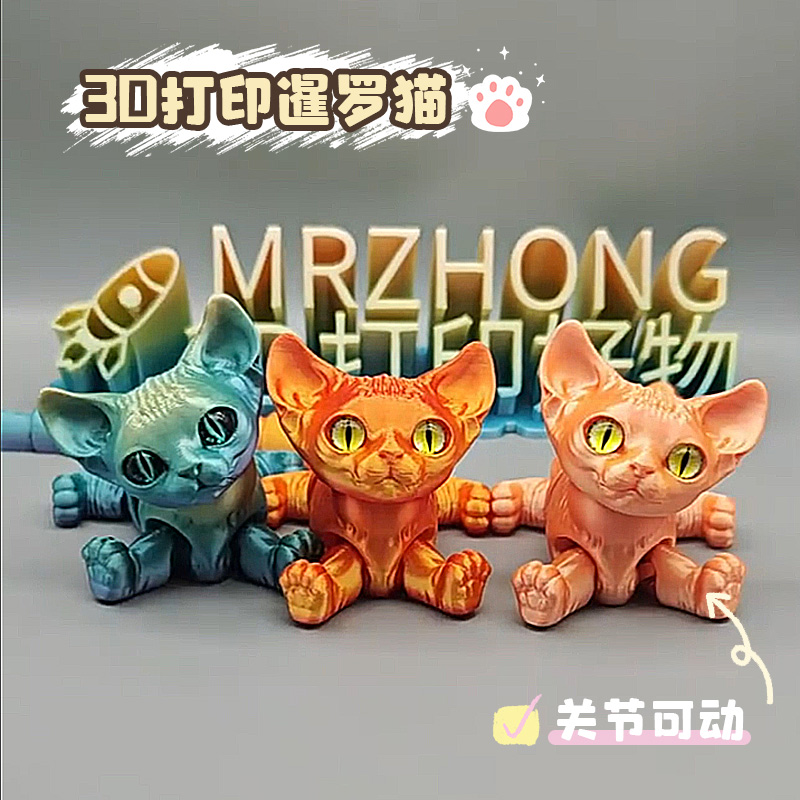 3D打印暹罗猫斯芬克斯无毛猫关节可动玩具桌面装饰摆件炫彩手办