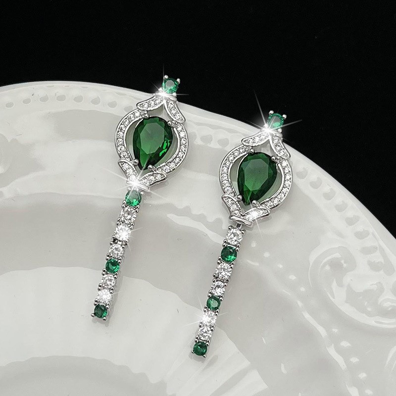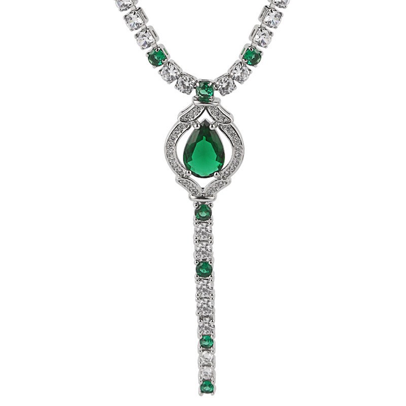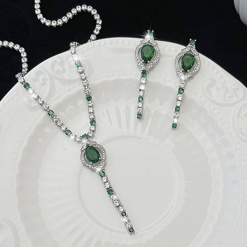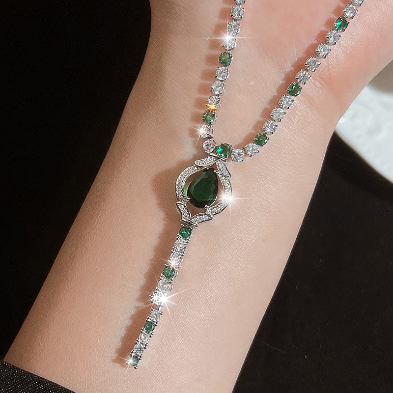 高级锁骨链祖母绿项链女设计感轻奢吊坠水滴耳钉锁骨链彩宝套装