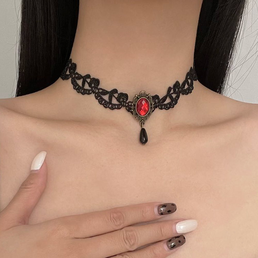 复古简约黑色蕾丝红宝石水滴项链女小众设计choker百搭颈带锁骨链