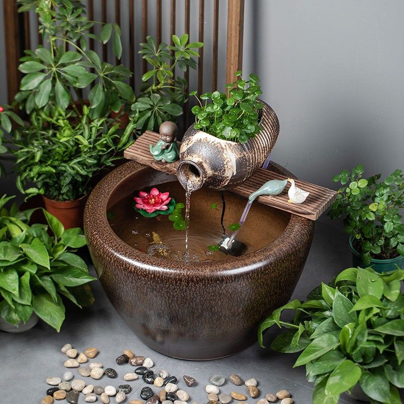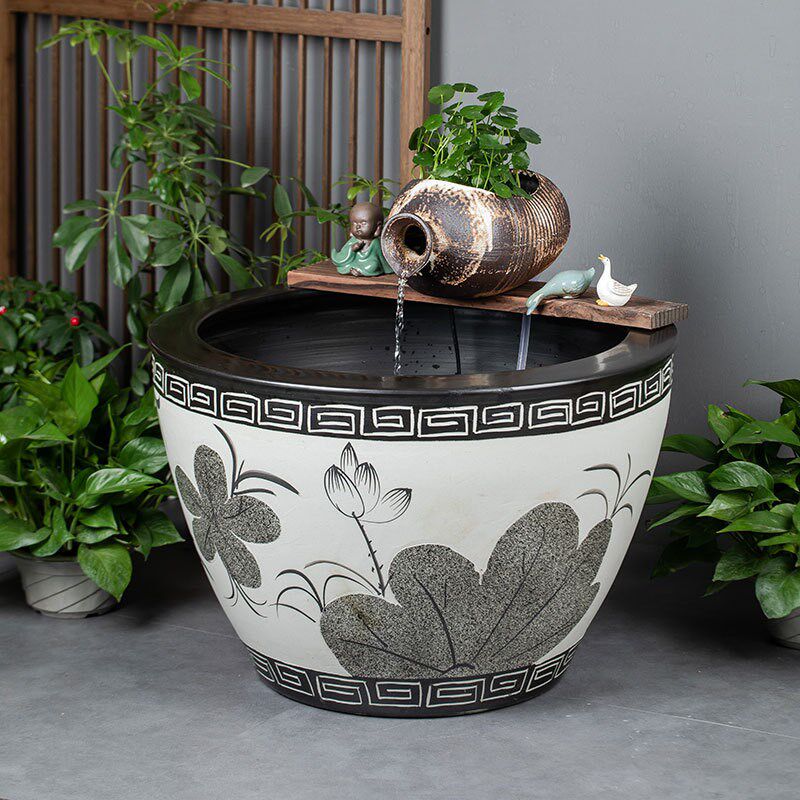 陶瓷鱼缸石槽古法养鱼水循环装饰陶罐流水造景水池花园喷泉