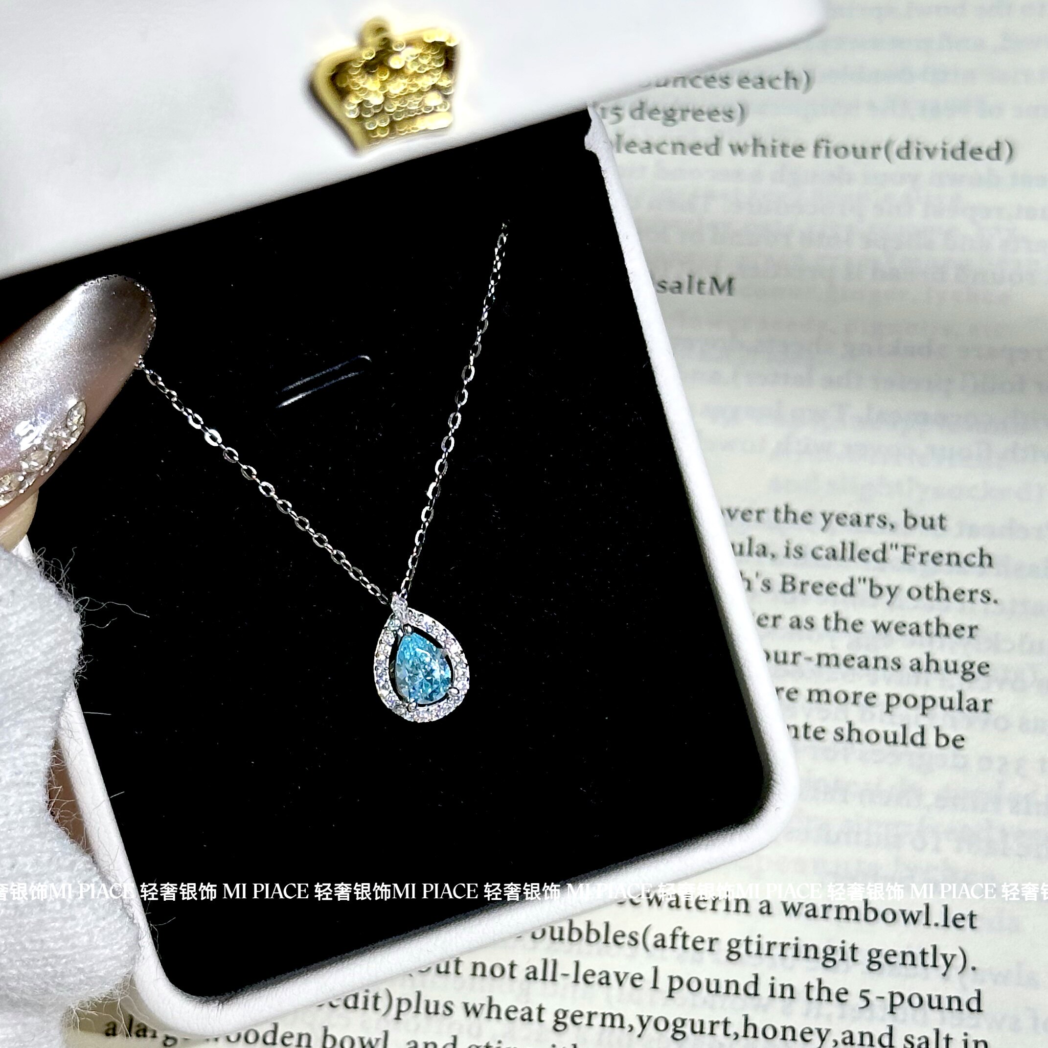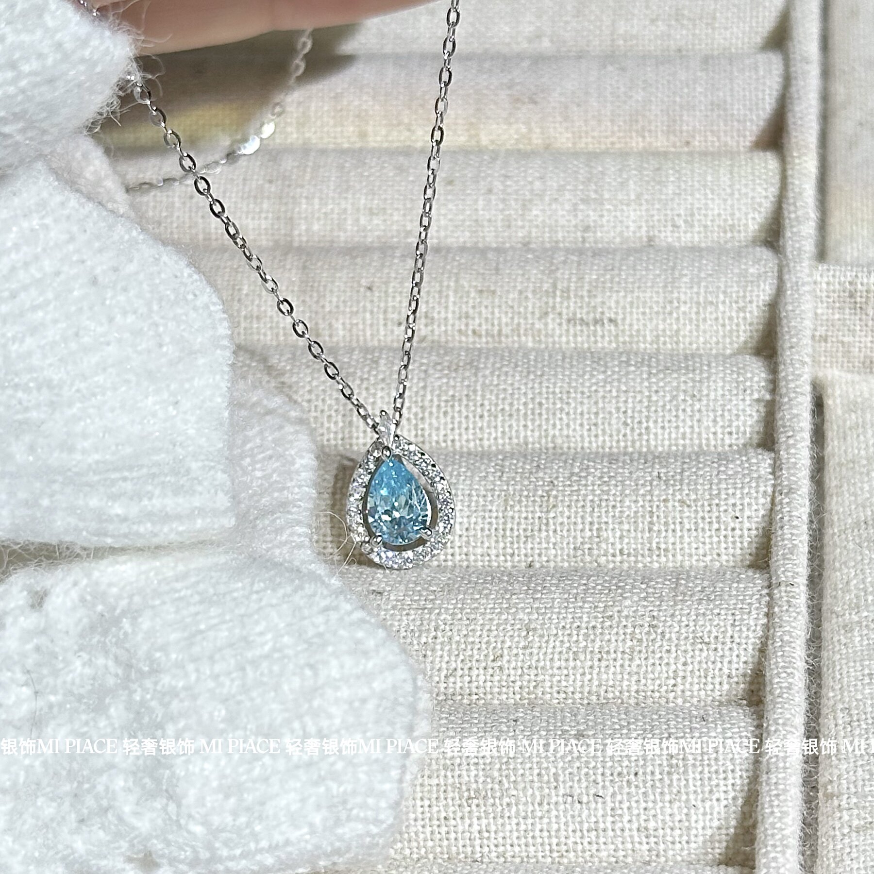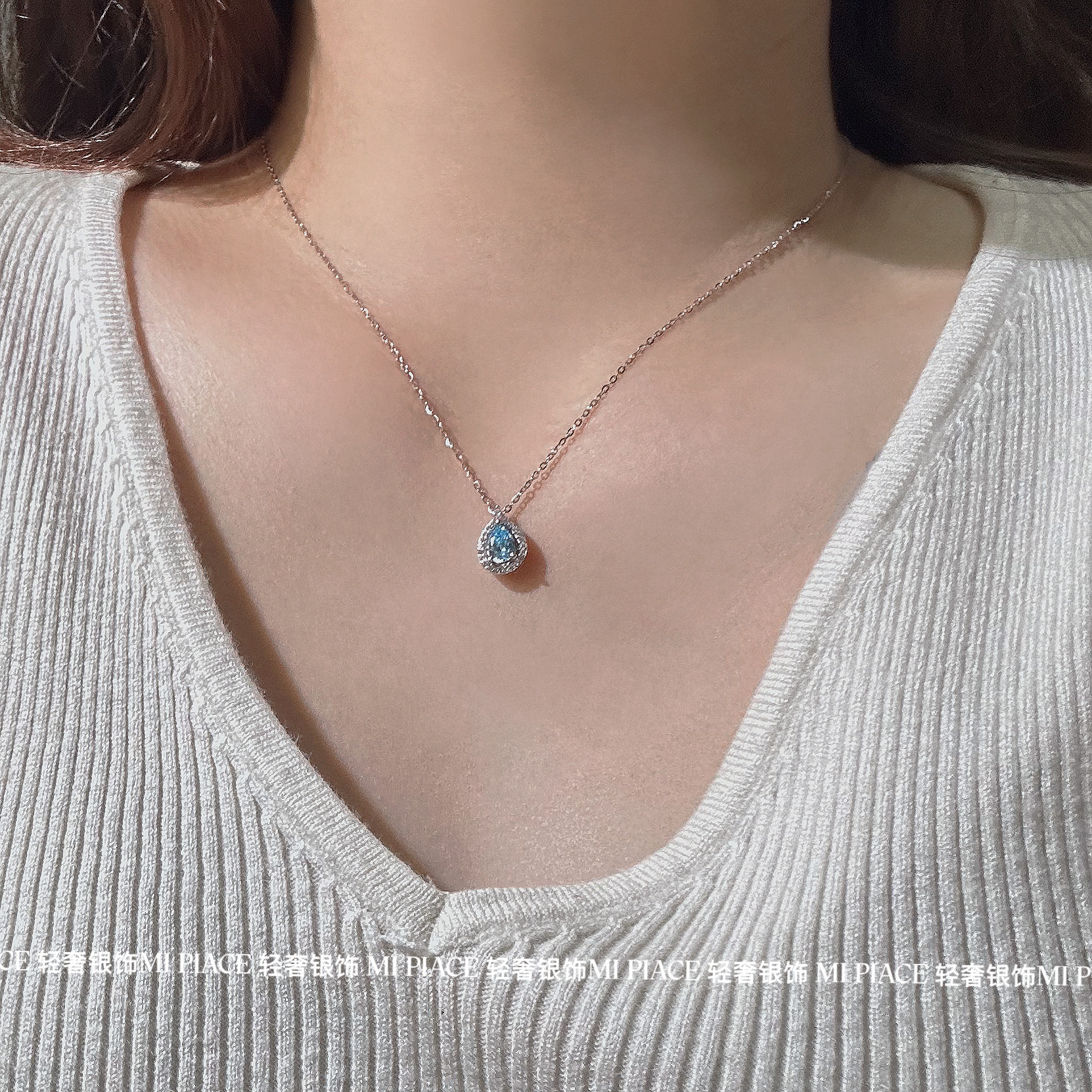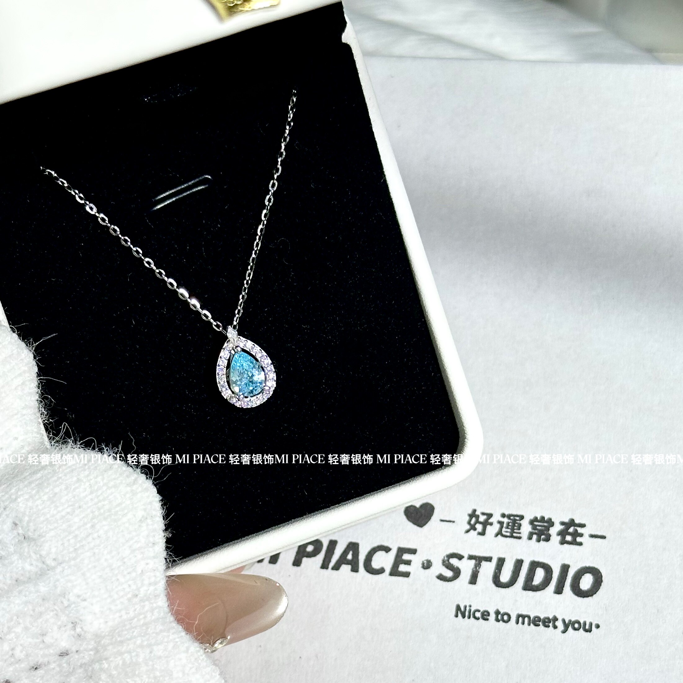 s999纯银蓝眼泪水滴项链女轻奢小众设计感锁骨链送闺蜜生日礼物