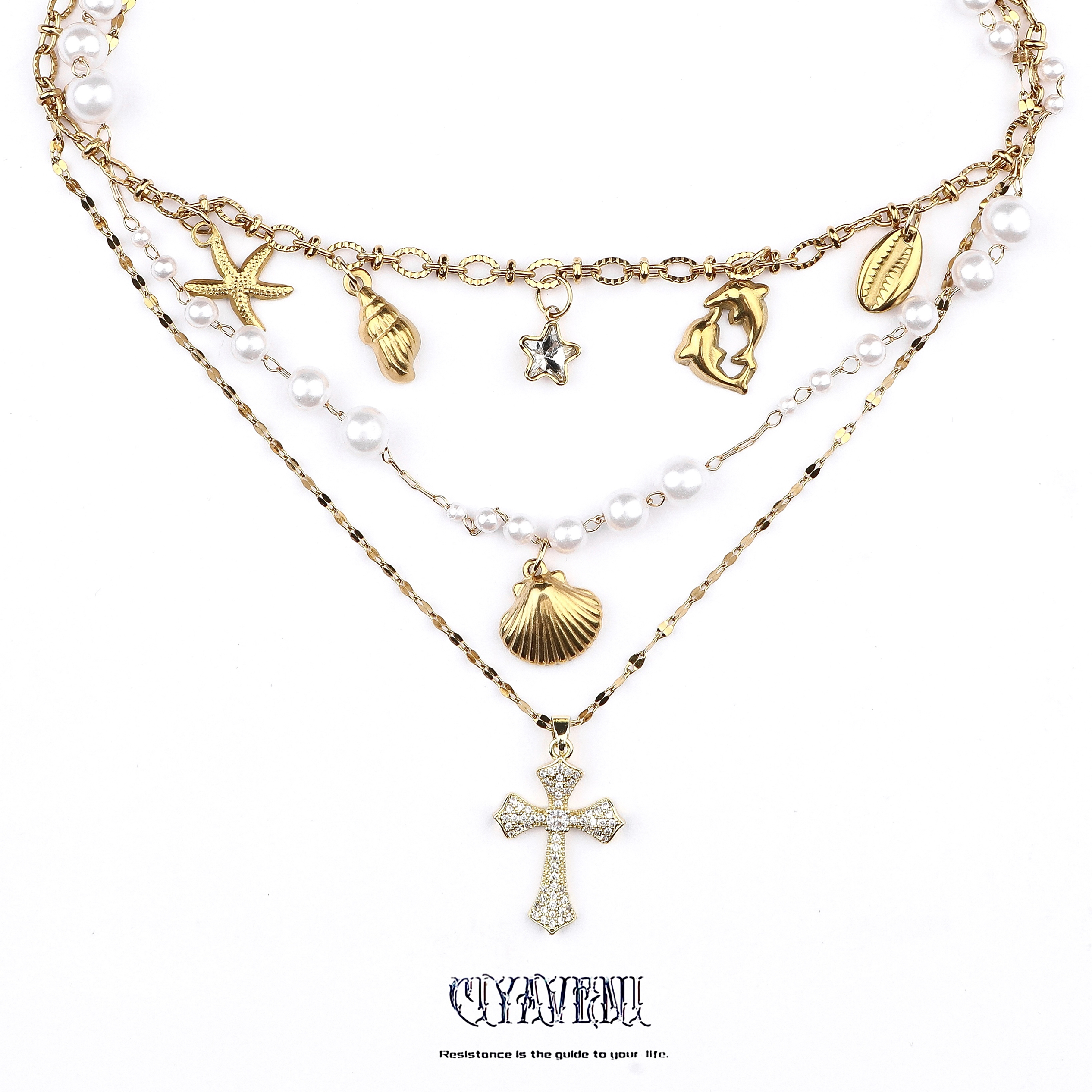 【内含三条】CIYAVENI巴洛克复古镶钻欧美金色十字架珍珠项链轻奢