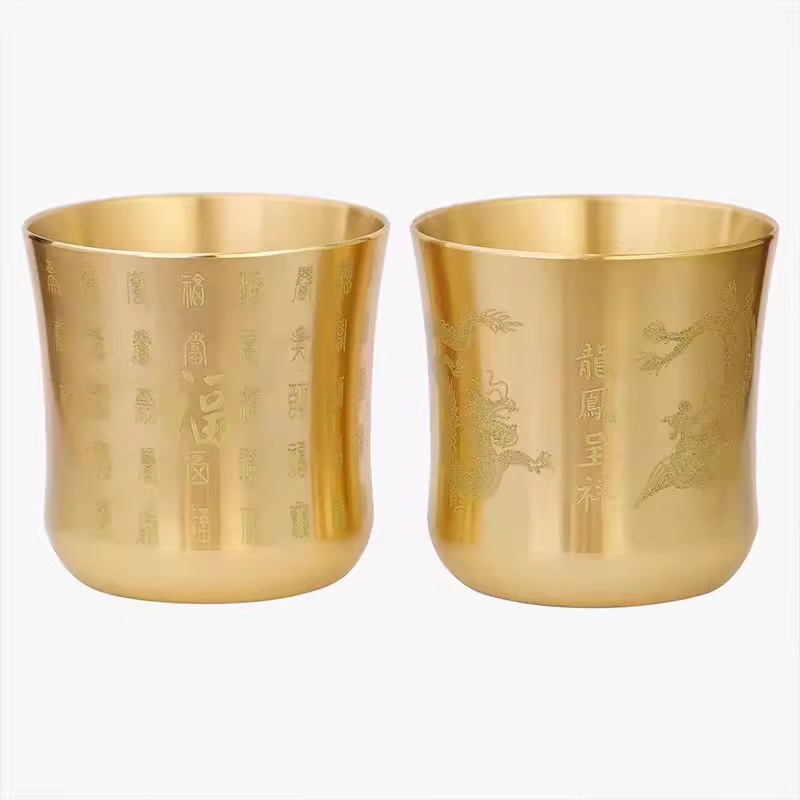 龙凤呈祥杯百福杯激光雕刻复古茶杯酒杯纯黄铜杯摆件黄铜茶桌装饰