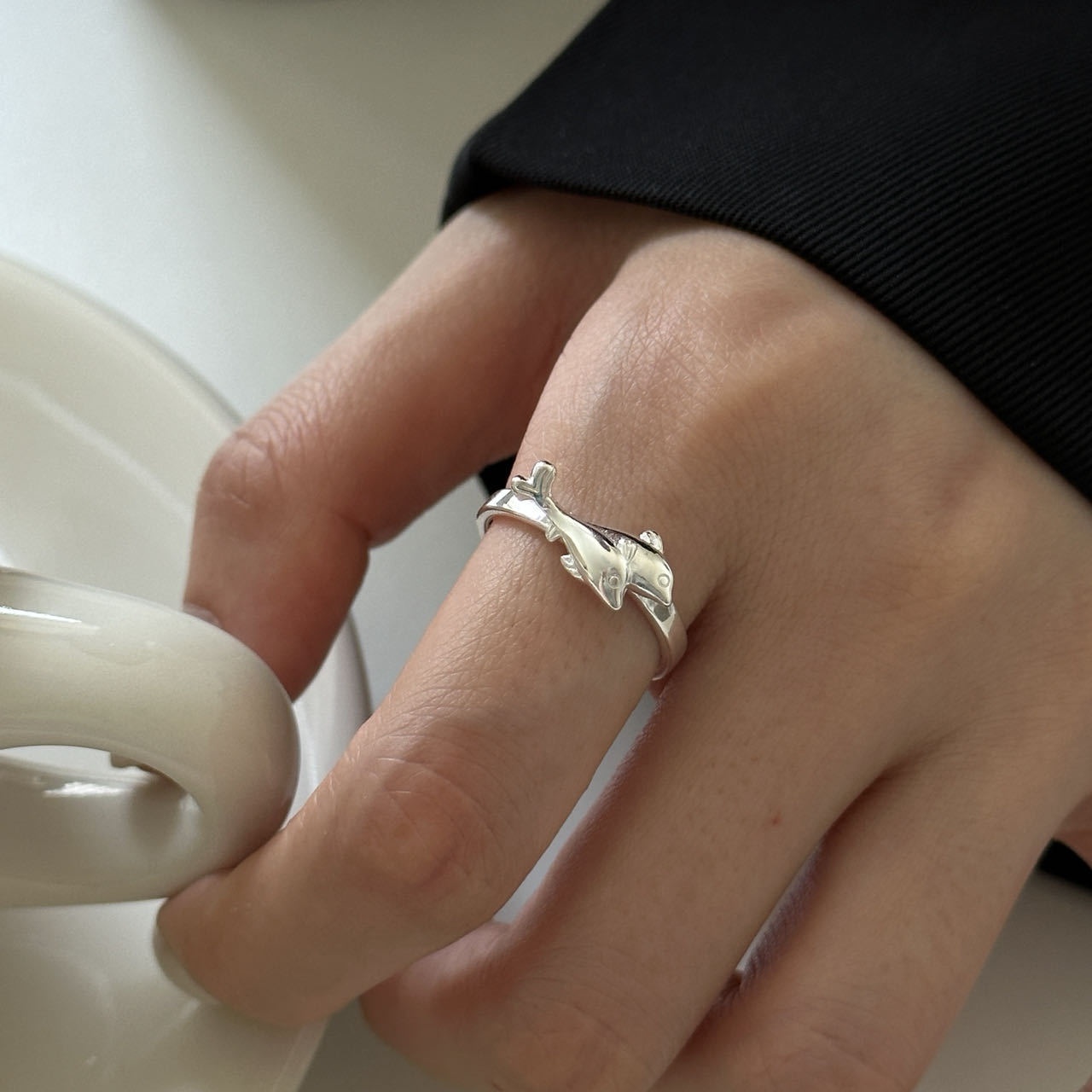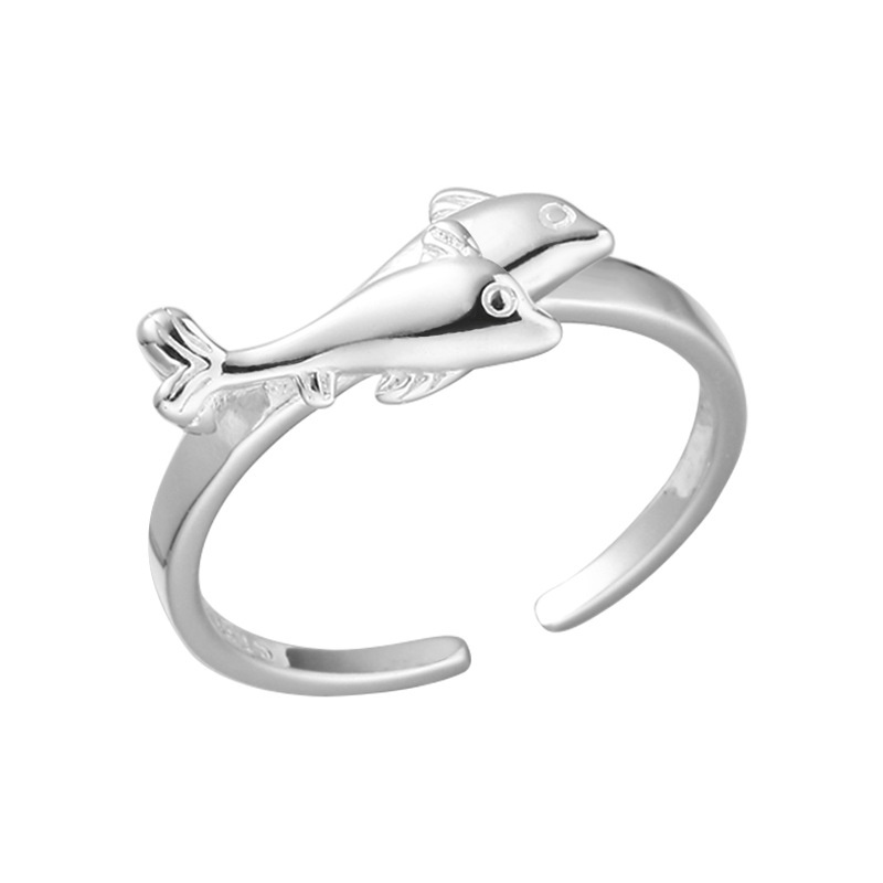 美汝仙 纯银双海豚戒指女亮银色简约创意设计开口指环新品轻奢高