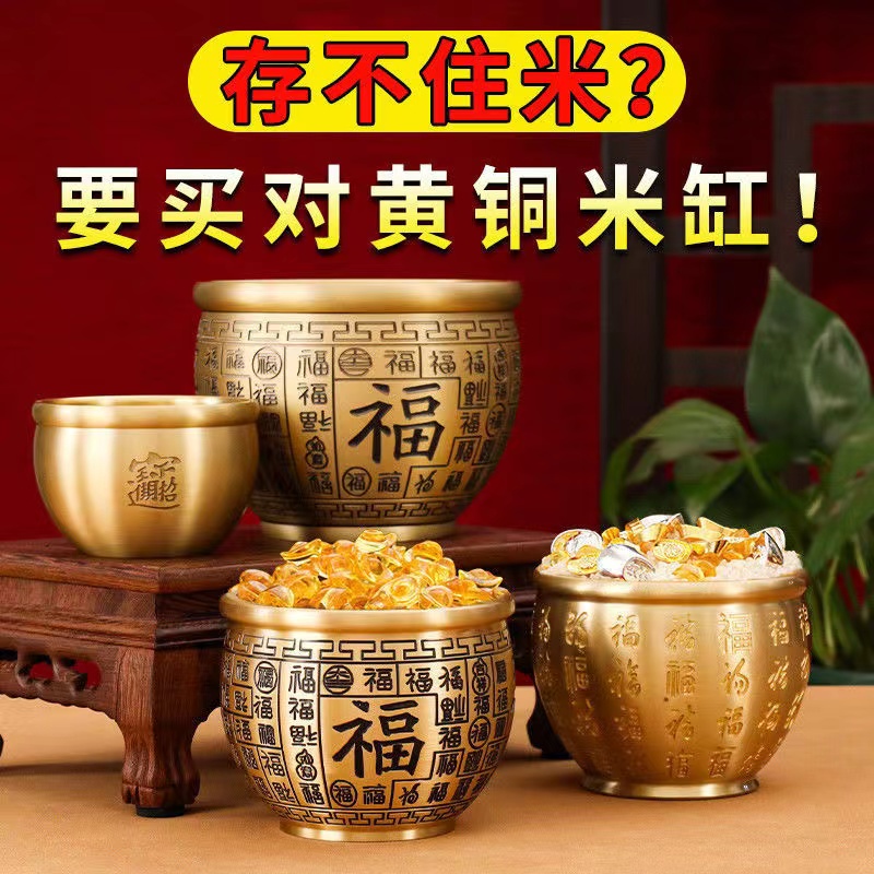 黄铜米缸聚财纯铜铜器百福小缸五福招财摆件抖音复古存钱罐
