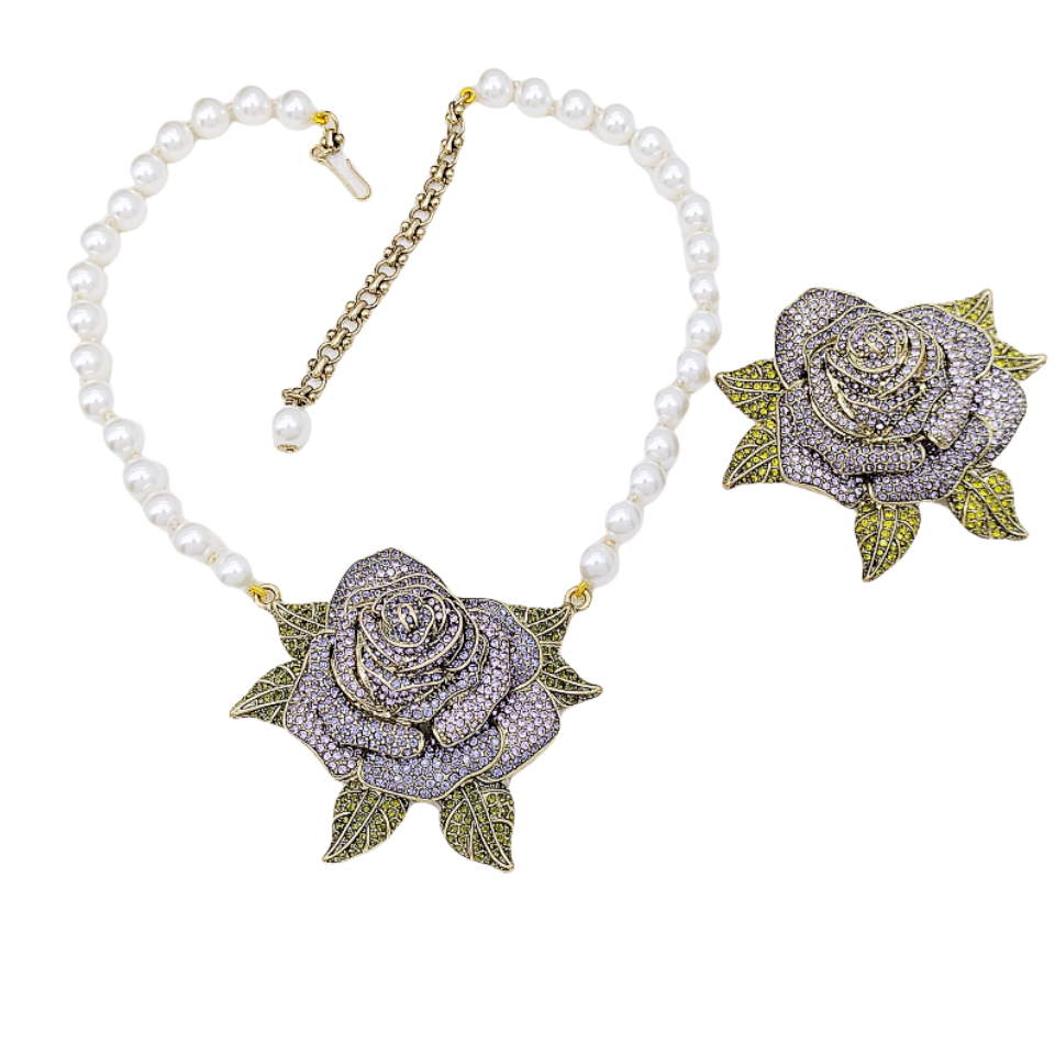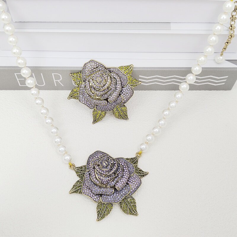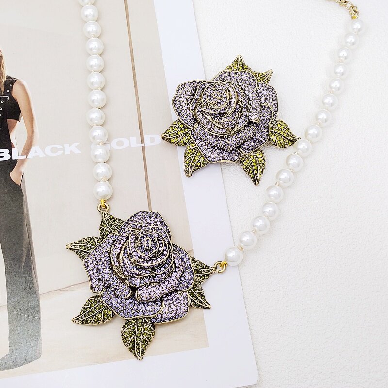 H14莉杭饰品打标精致潮流紫色玫瑰花立体镶钻做旧感珍珠胸针项链