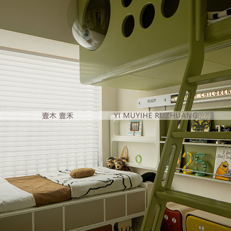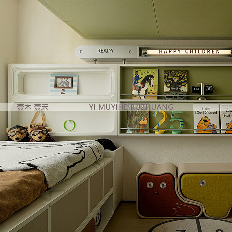 现代绿色系样板间儿童房艺术创意书籍小熊公仔软装搭配书柜摆件