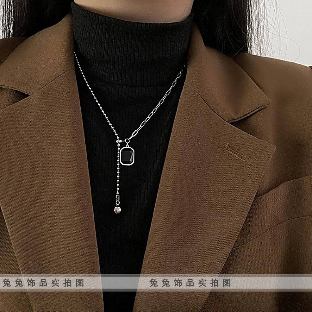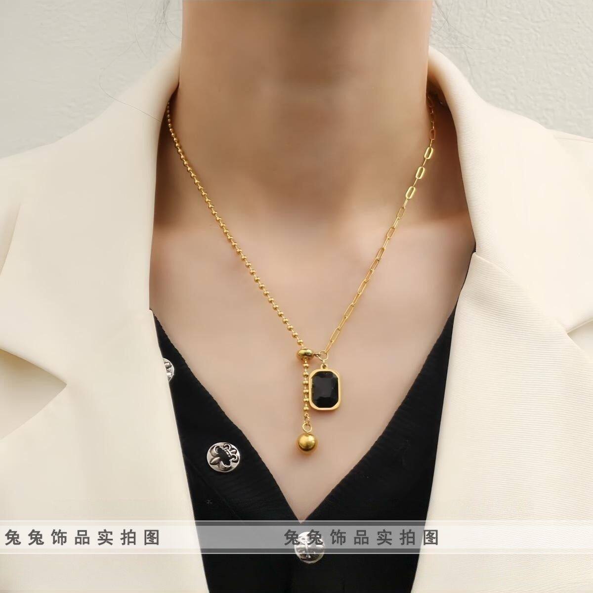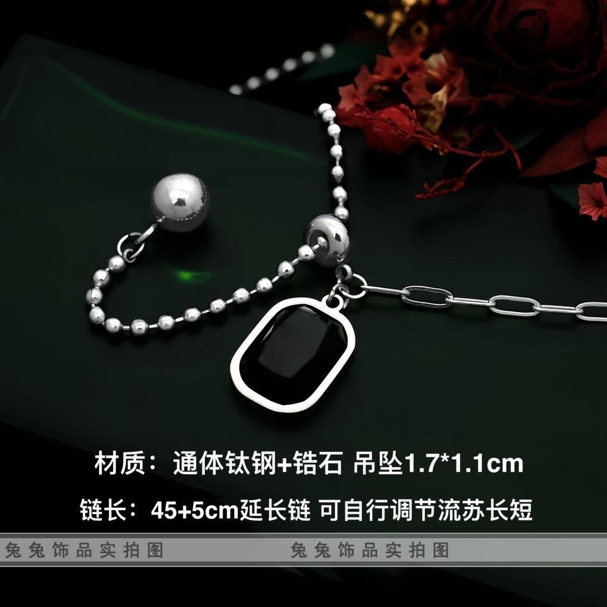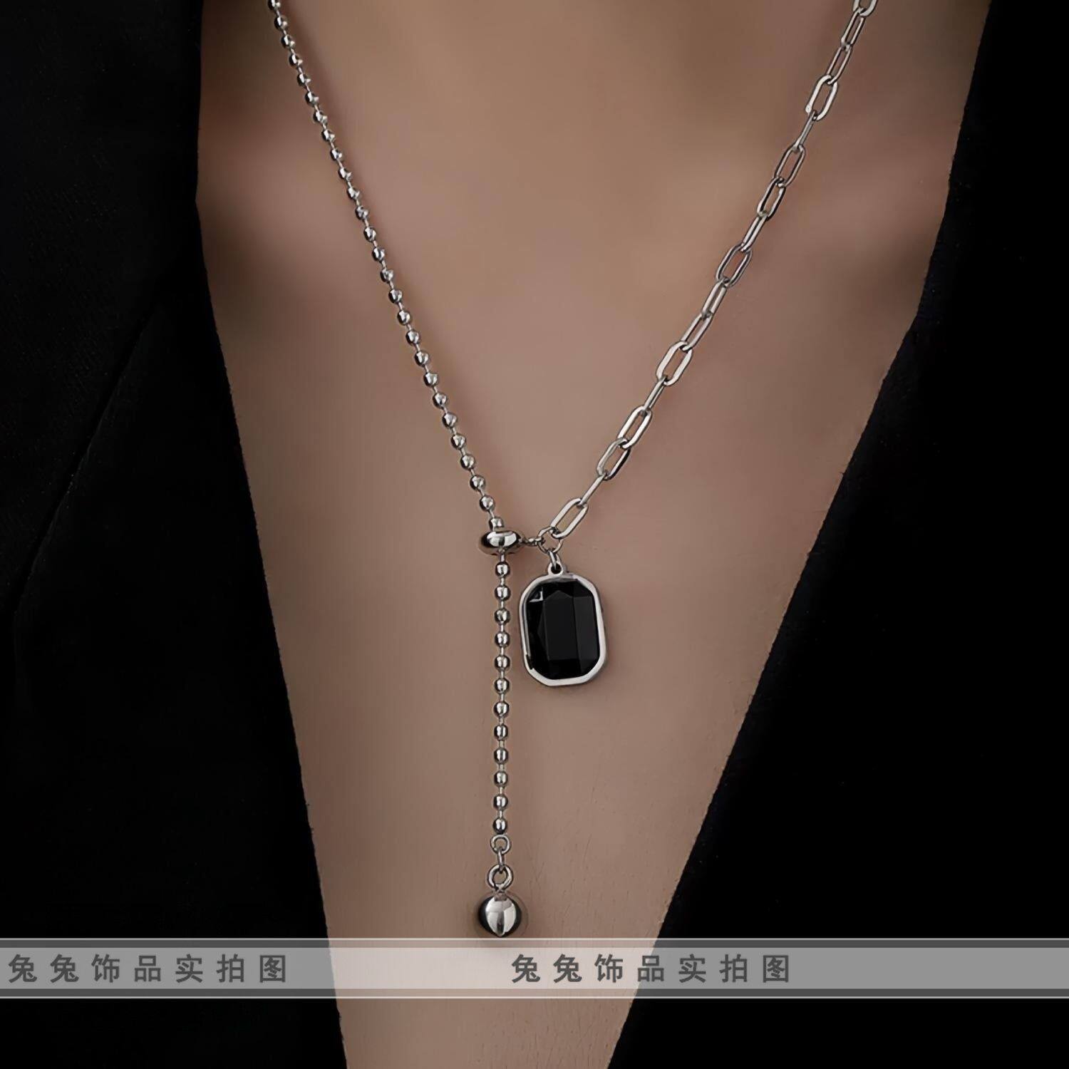 【钛钢不掉色】黑方糖方块水晶锆石可拉伸流苏不对称抖音闺蜜项链