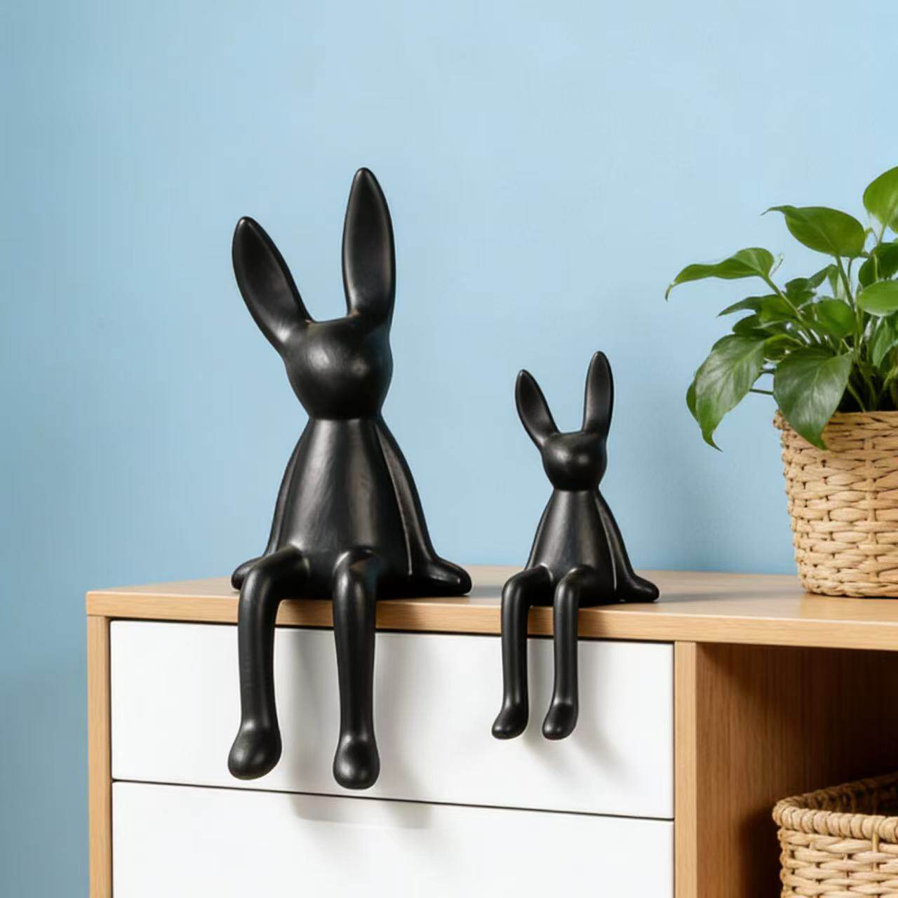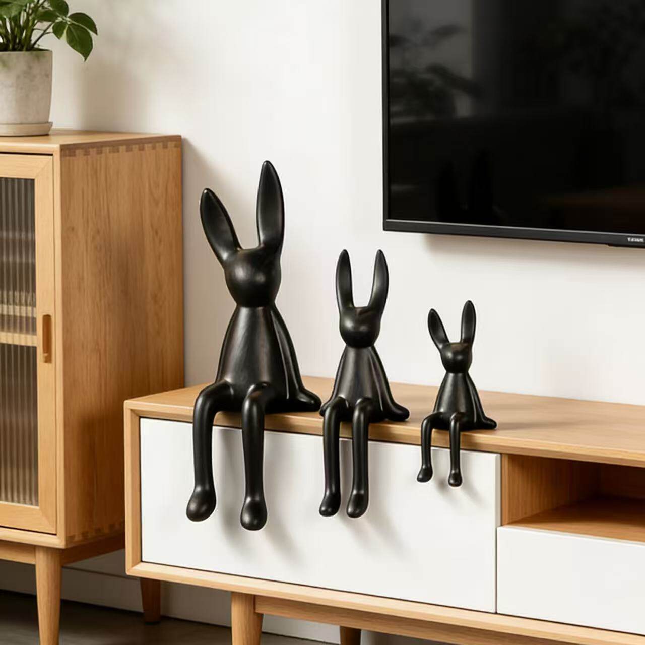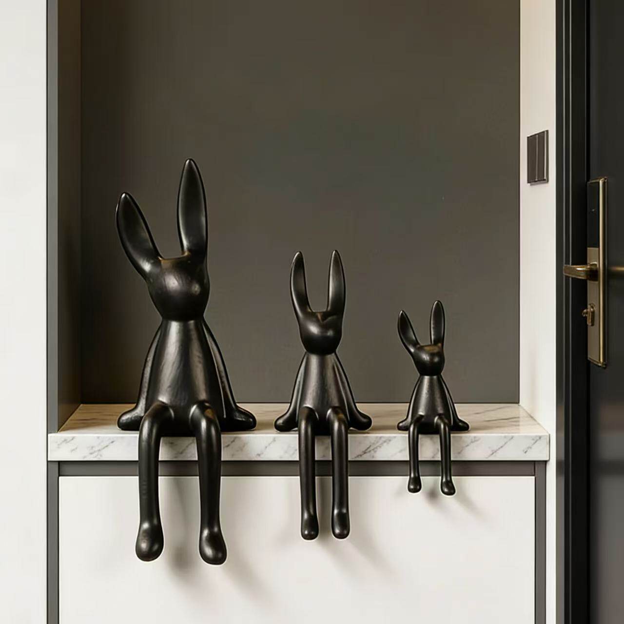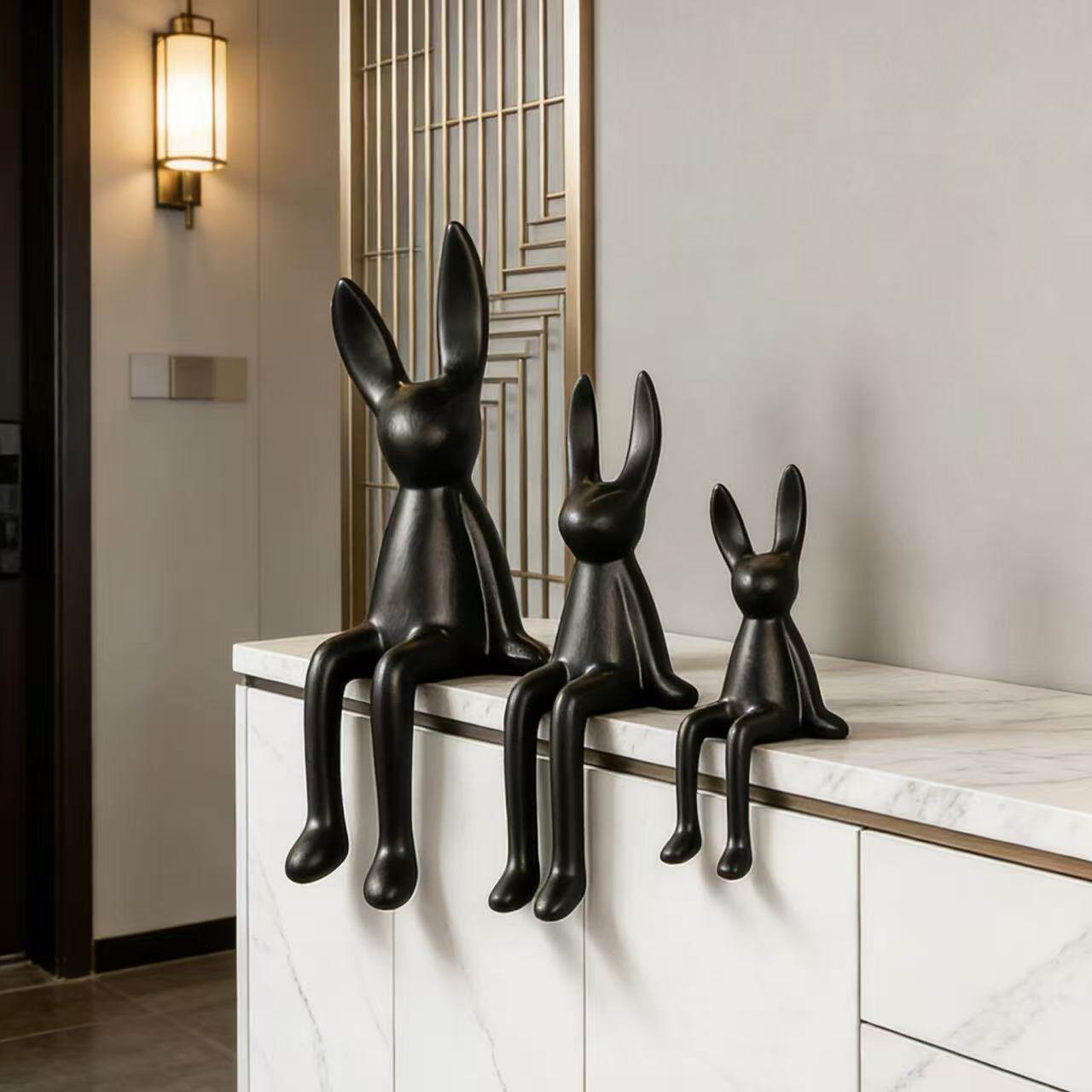 简约现代长耳朵坐姿兔子陶瓷摆件客厅桌面装饰品酒店黑色家居饰品