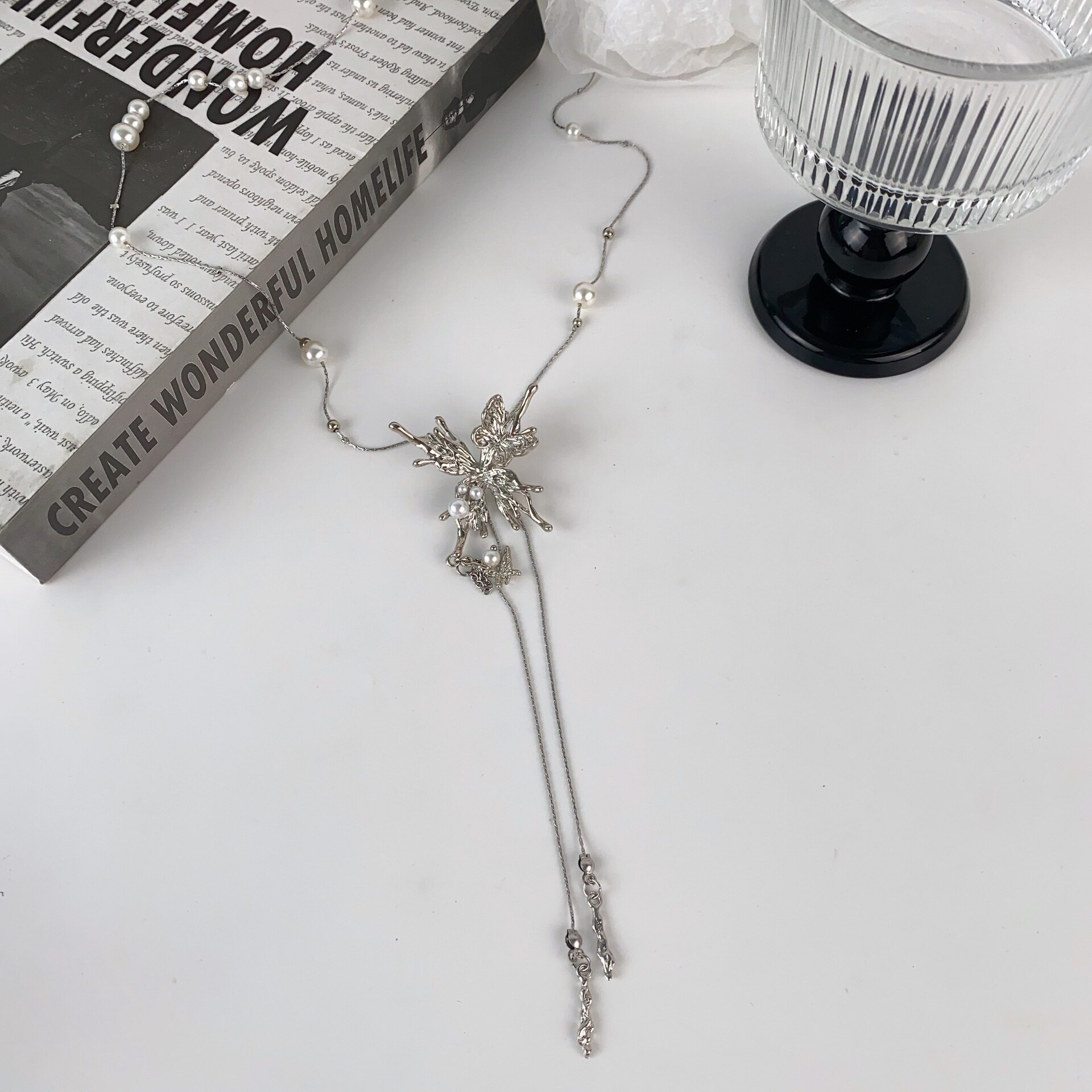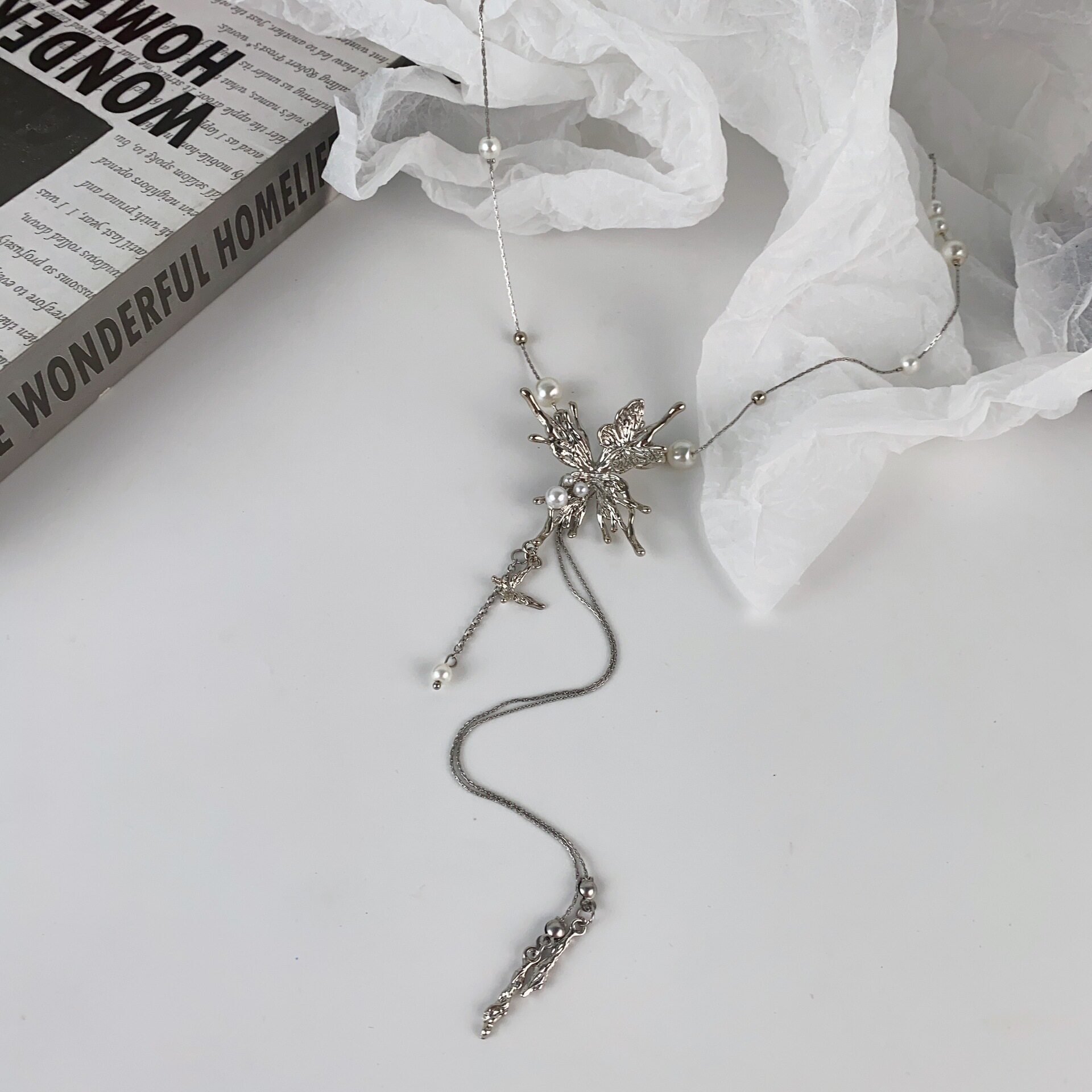 珍珠蝴蝶项链长款毛衣链精致高级感轻奢小众锁骨链甜酷个性风现货