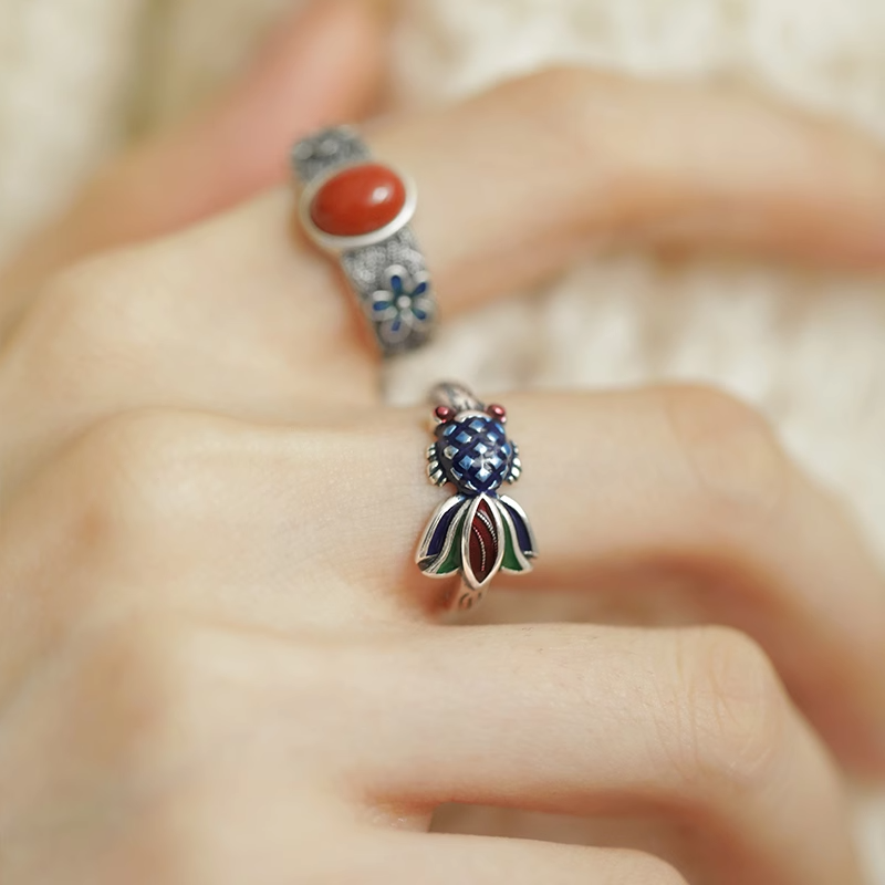蓝色珐琅好运锦鲤戒指女小众设计复古高级感苗疆异域民族风食指环
