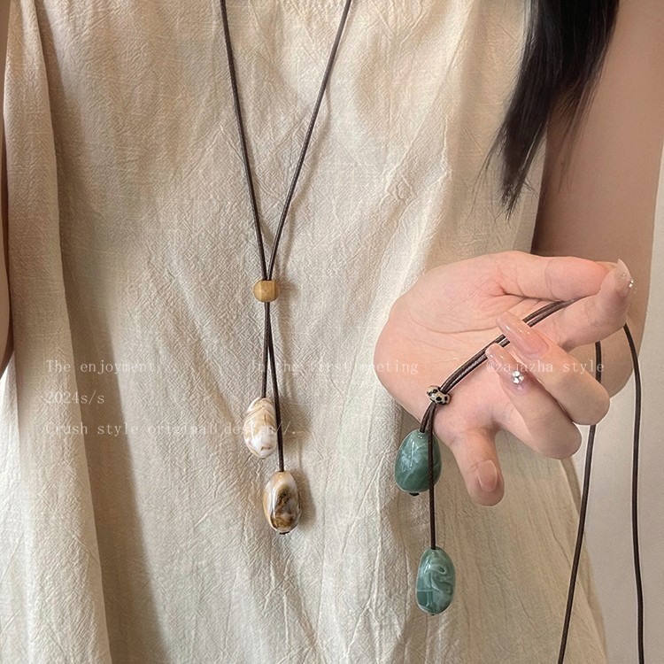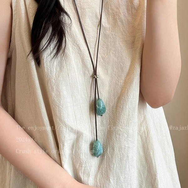 2025绿色木质圆珠长款项链吊坠绳女款森系复古设计毛衣链小众挂脖