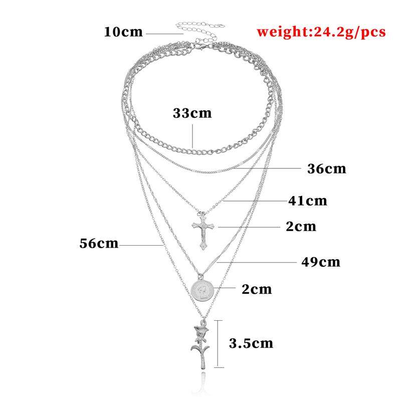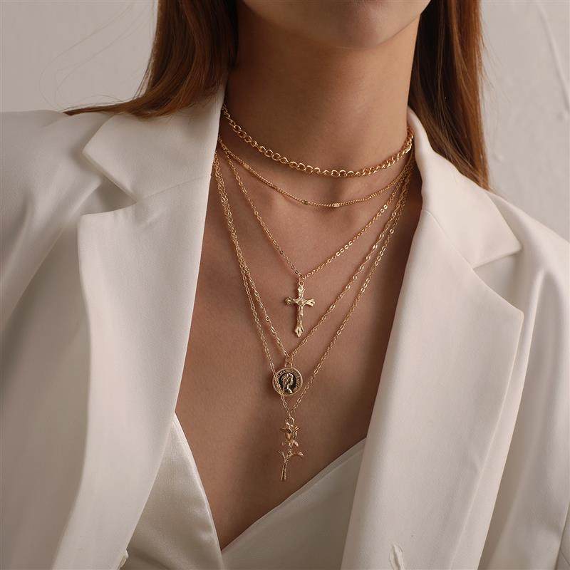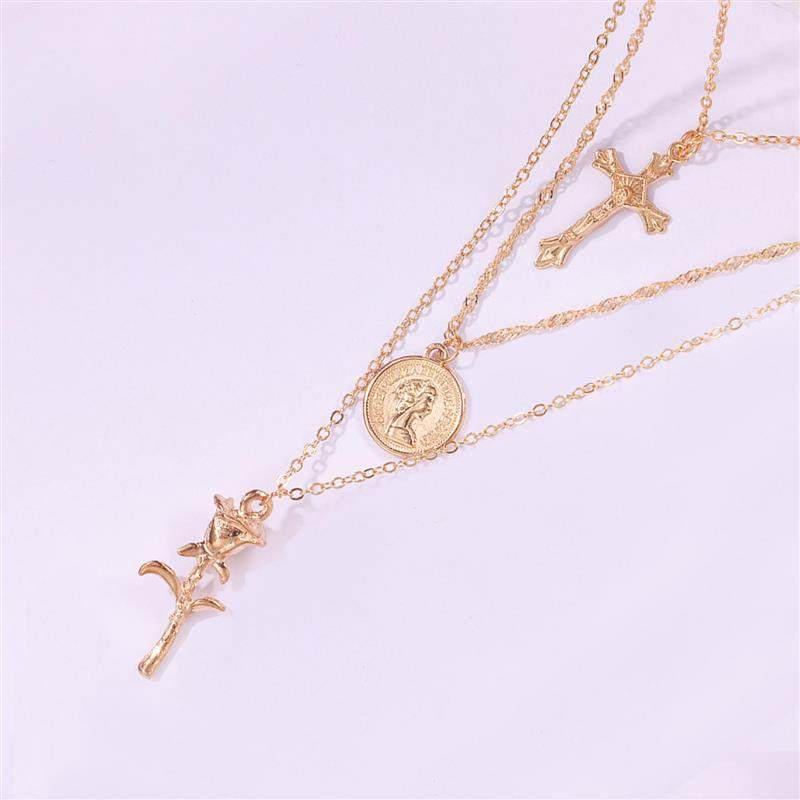 欧美跨境饰品 时尚十字架女王头像吊坠项链女 气质多层玫瑰花项饰