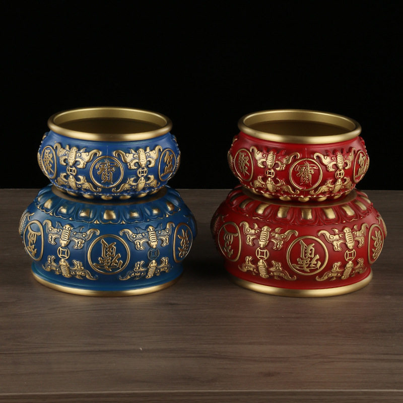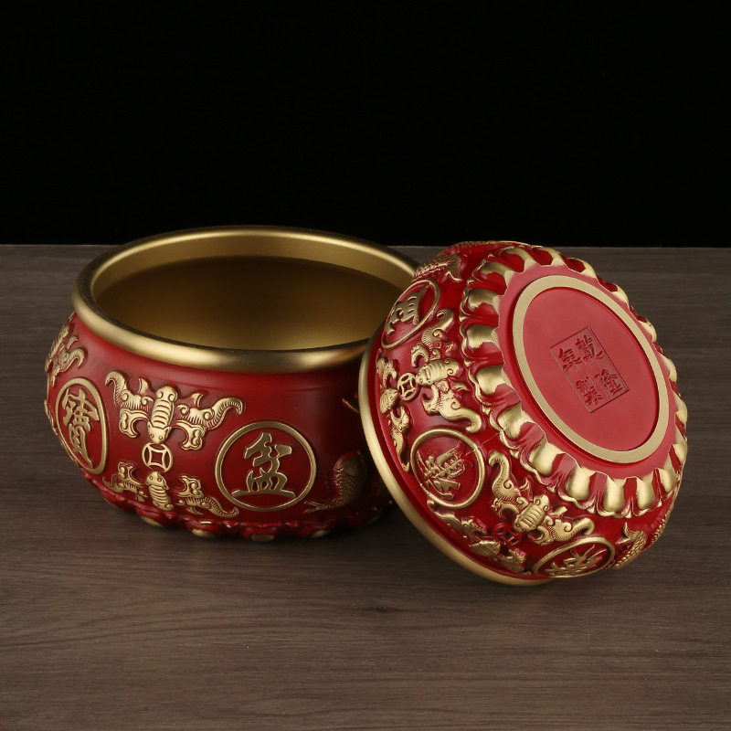 黄铜八宝聚宝盆八福聚宝盆彩绘红色聚宝盆摆件家居办公室摆设