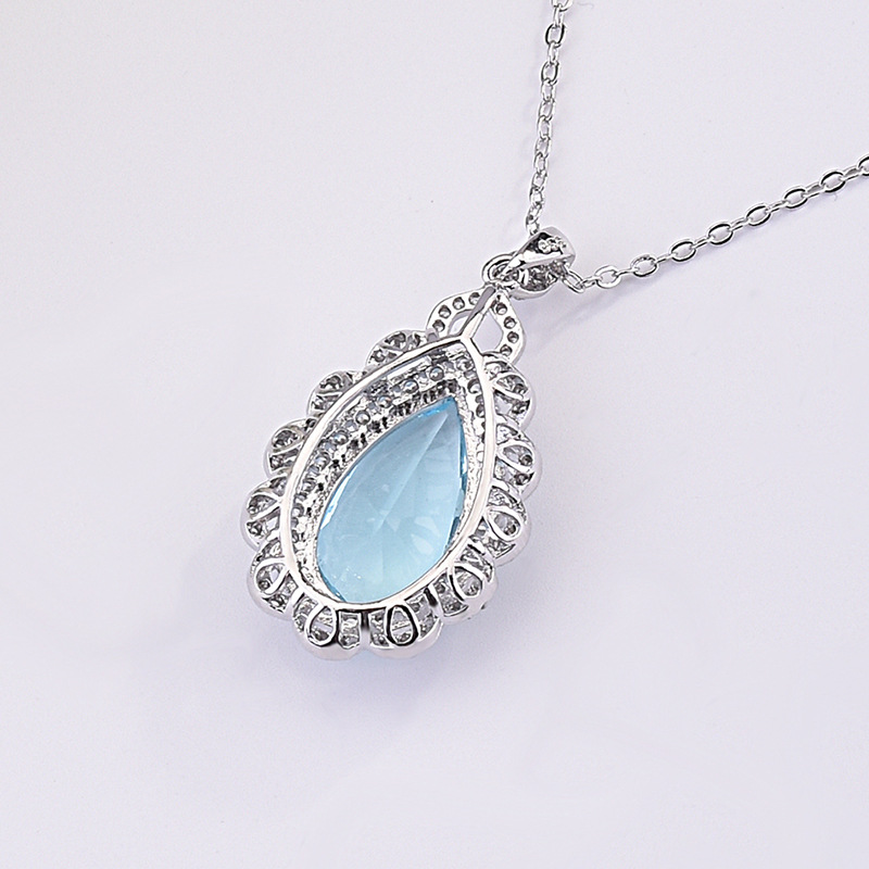 Young奢华满钻镶嵌海蓝托帕石水滴梨形项链婚庆宴会派对银吊坠女
