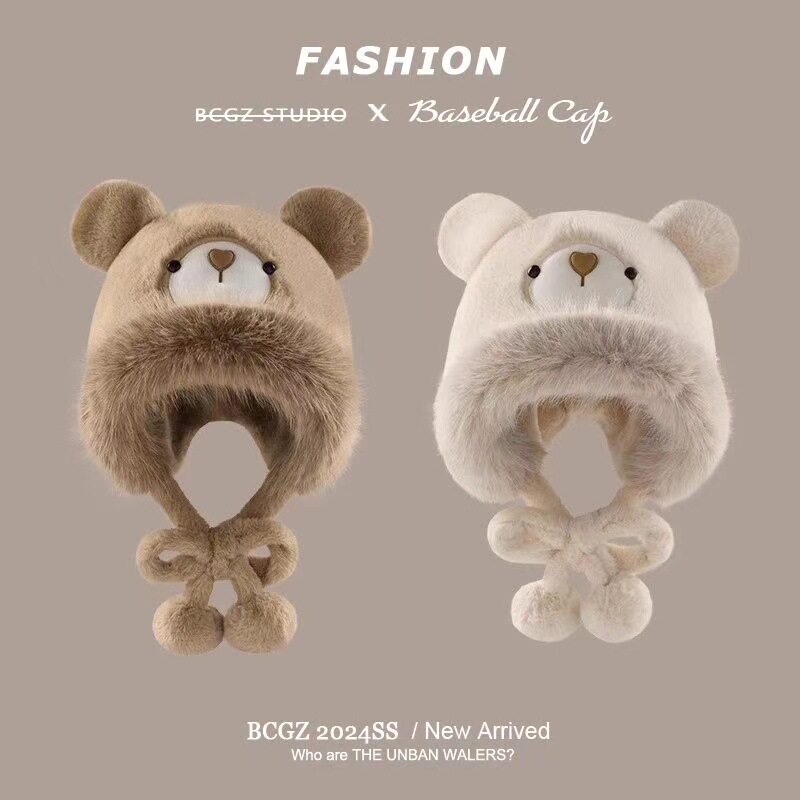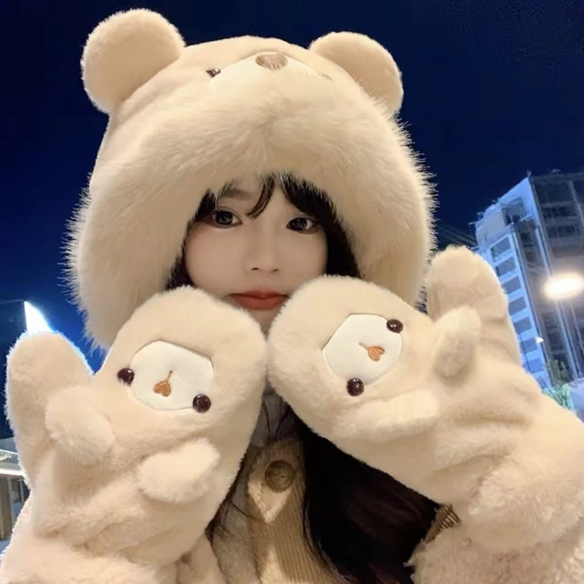 毛绒小熊帽子手套女秋冬季加绒加厚保暖护耳套头帽可爱雷锋帽骑车