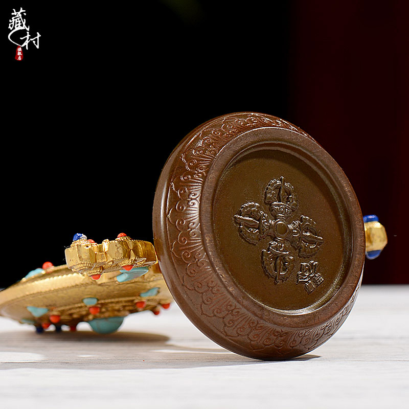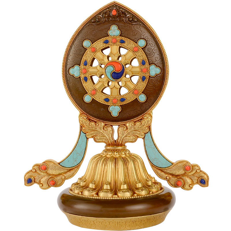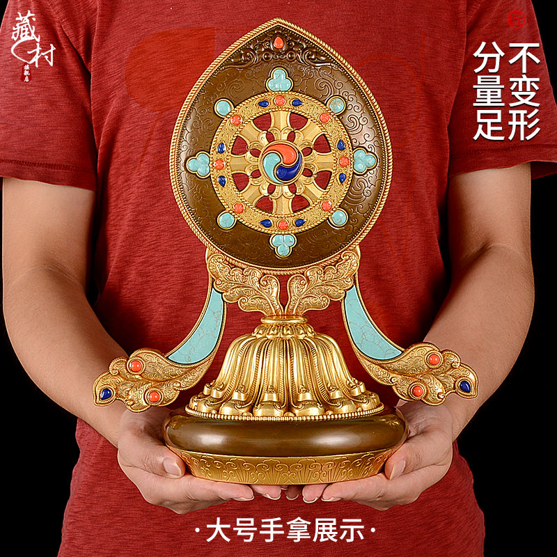 藏村吉祥八宝家用八吉祥雕花全铜鎏金轮王七珍宝金轮摆件装饰品