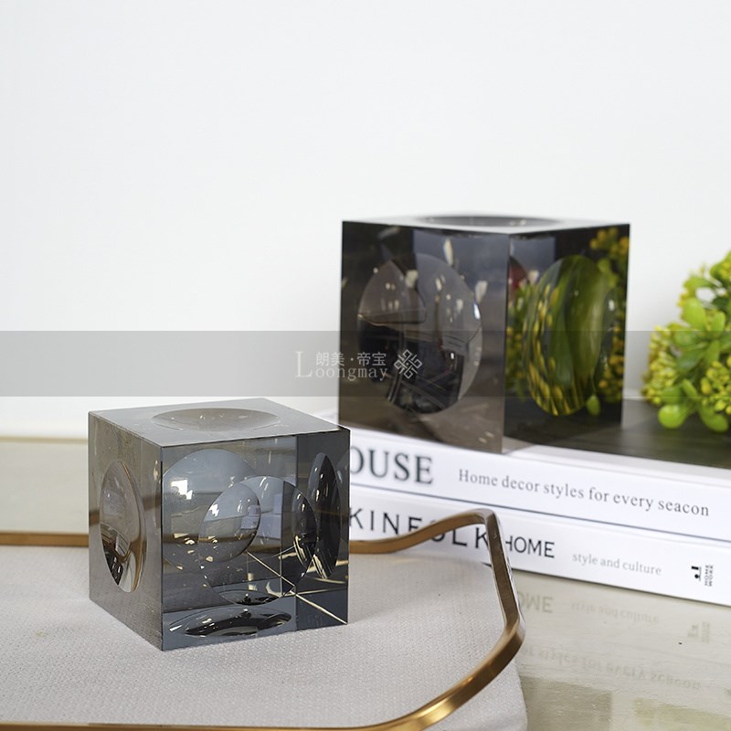 现代轻奢灰色方形水晶摆件样板房客厅书柜桌面咖色方块创意装饰品