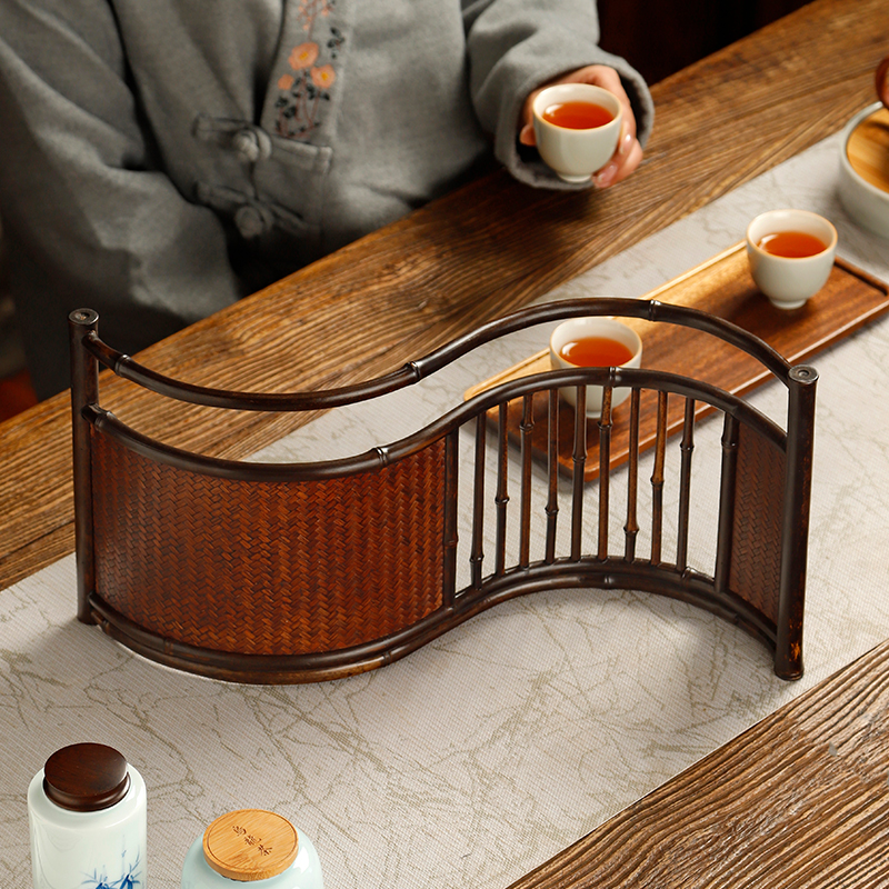 紫竹大漆曲面小屏风桌面竹编栅栏围栏隔断竹制茶道装饰布景摆件