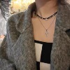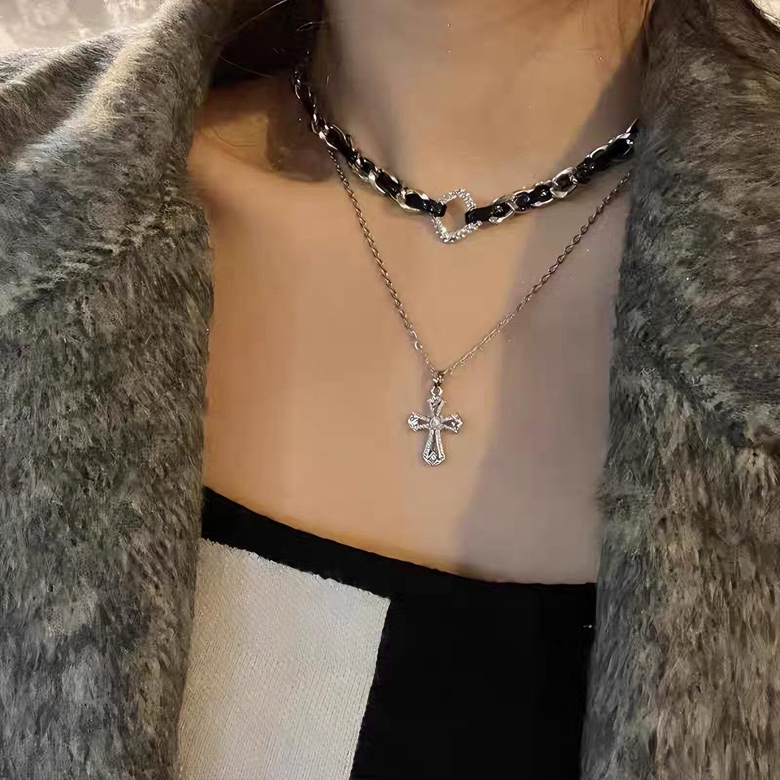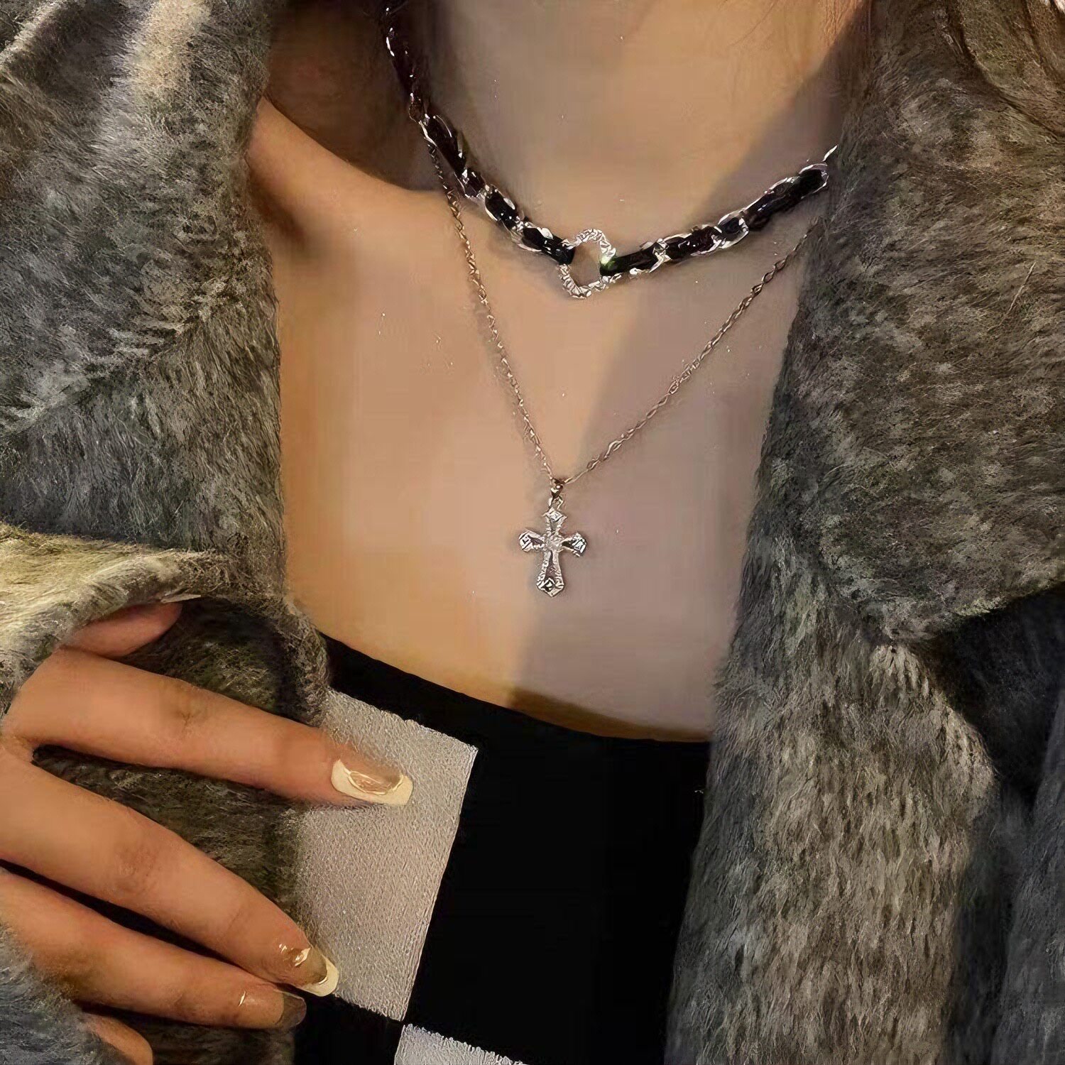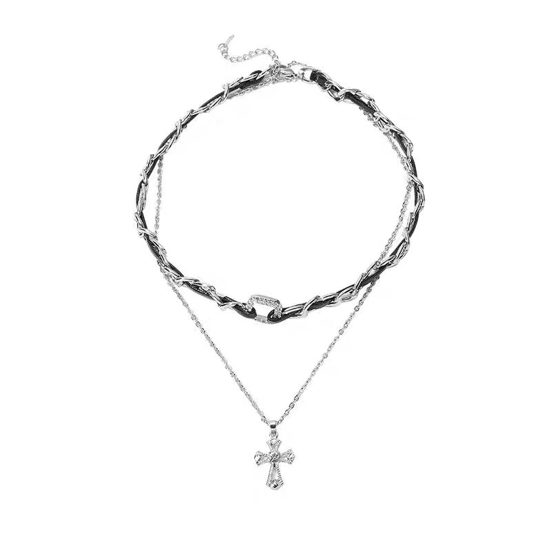 小众设计十字架双层叠戴项链女甜酷风皮质编织项圈个性锁骨链颈链