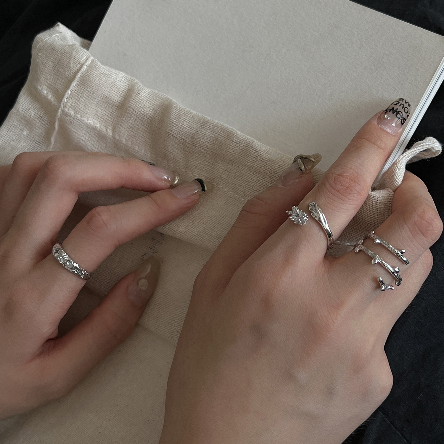 925纯银戒指女款个性时尚ins小众设计树枝肌理镶钻开口戒指冷淡风
