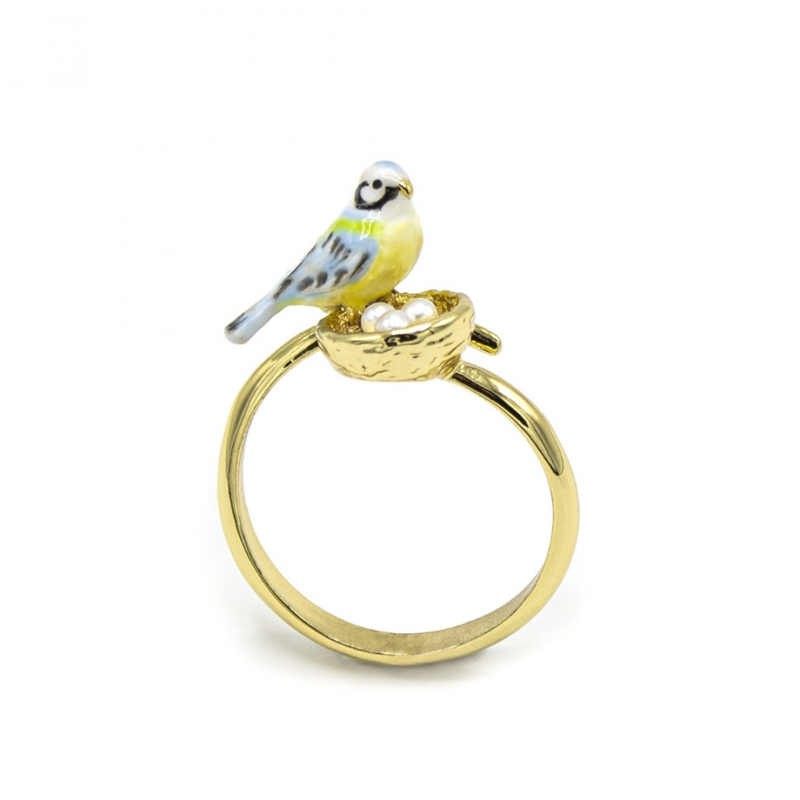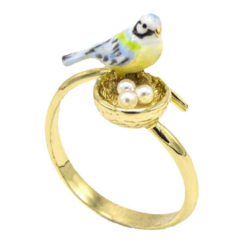 英国彩绘珐琅可爱山雀小鸟鹦鹉鸟窝珍珠鸟蛋戒指女开口指环可调节