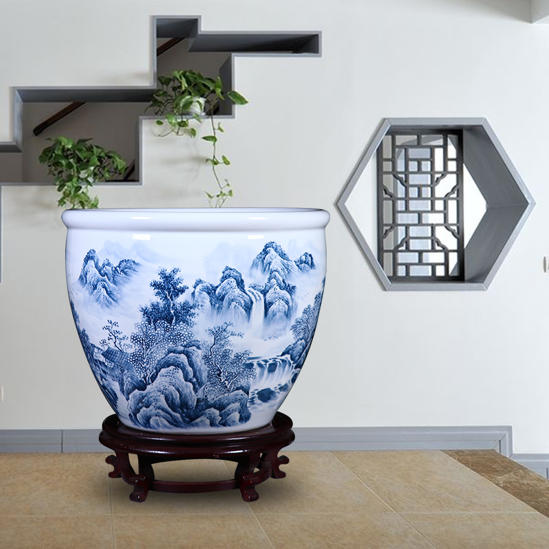 景德镇名师手绘青花山水陶瓷鱼缸客厅养鱼乌龟缸睡莲荷花盆大摆件
