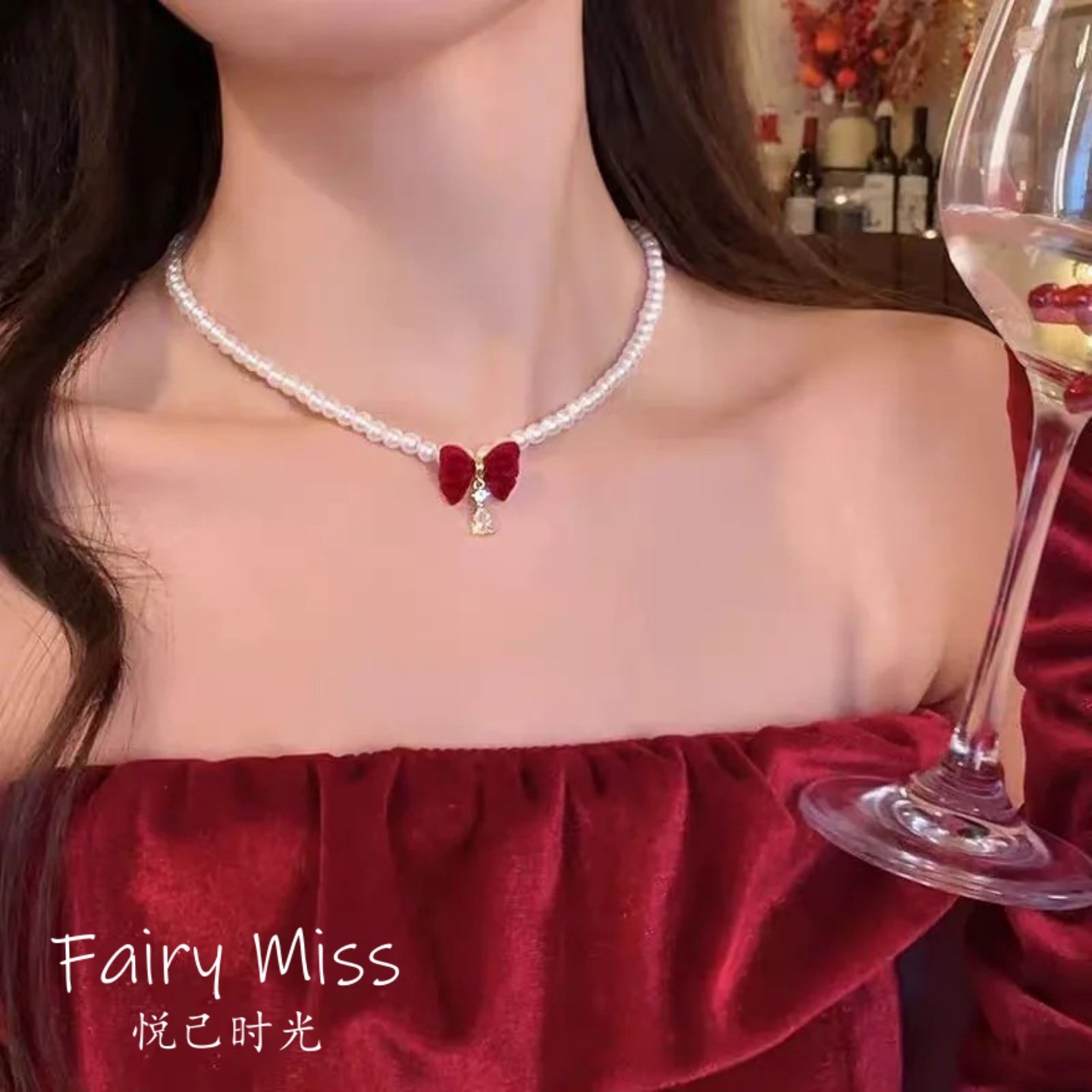 「黛芬奇」红色丝绒蝴蝶结珍珠项链女过年氛围饰品秋冬毛衣锁骨链