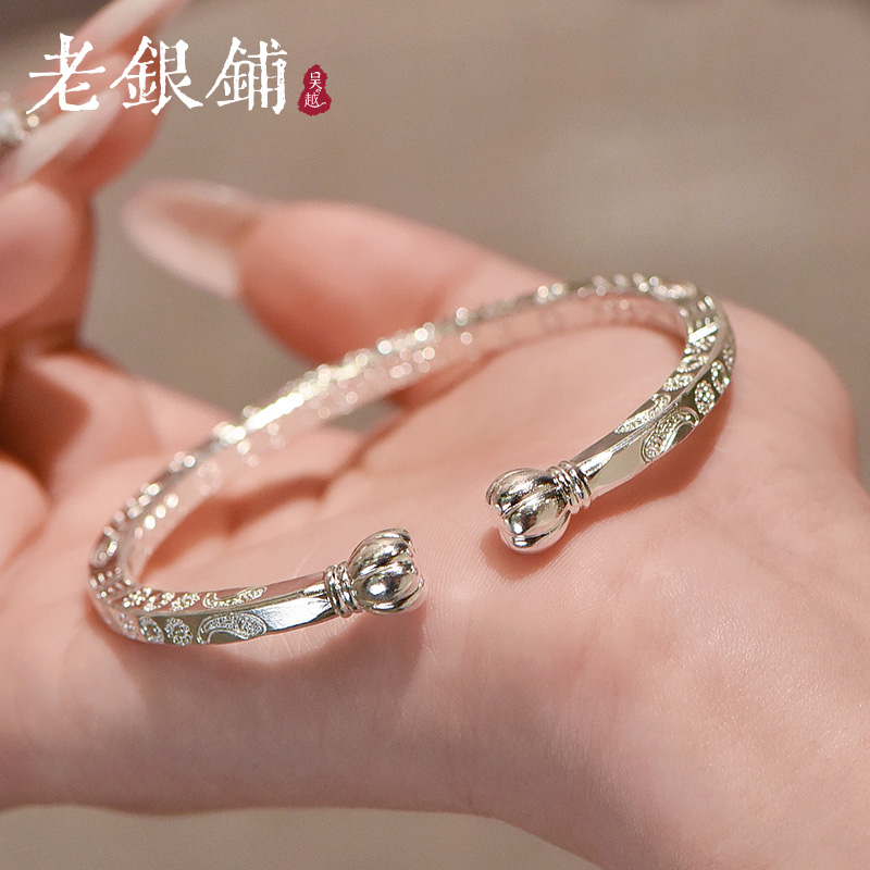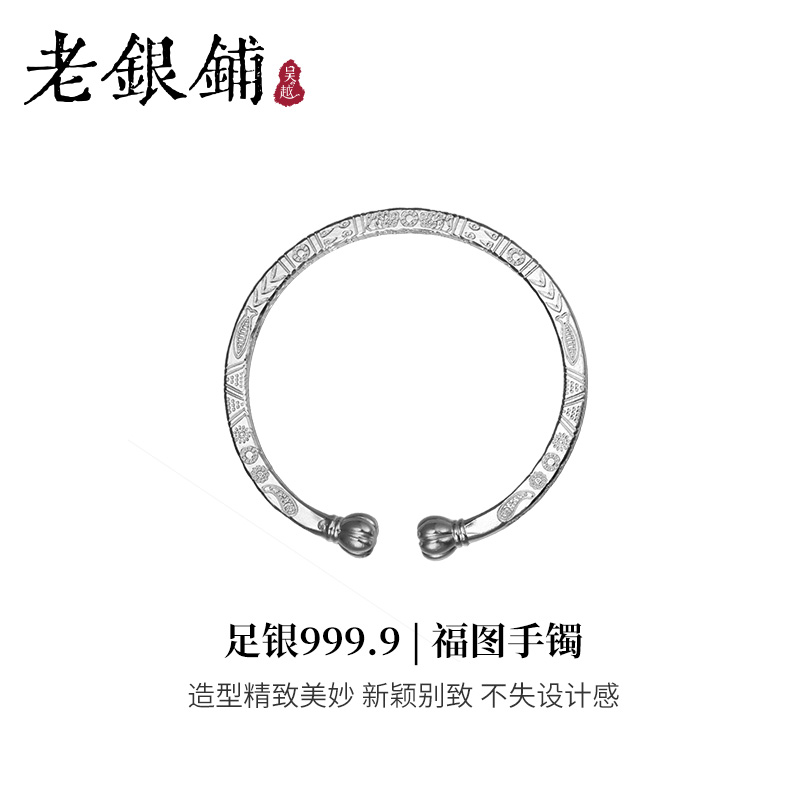 吴越老银铺正品足银9999福图手镯女款开口银镯纯银镯子送女友礼物