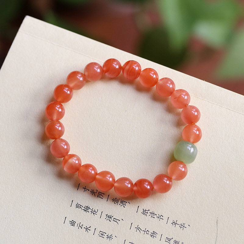 天然川料樱桃南红玛瑙手串单圈搭配和田玉女款手链圆珠手饰橙色