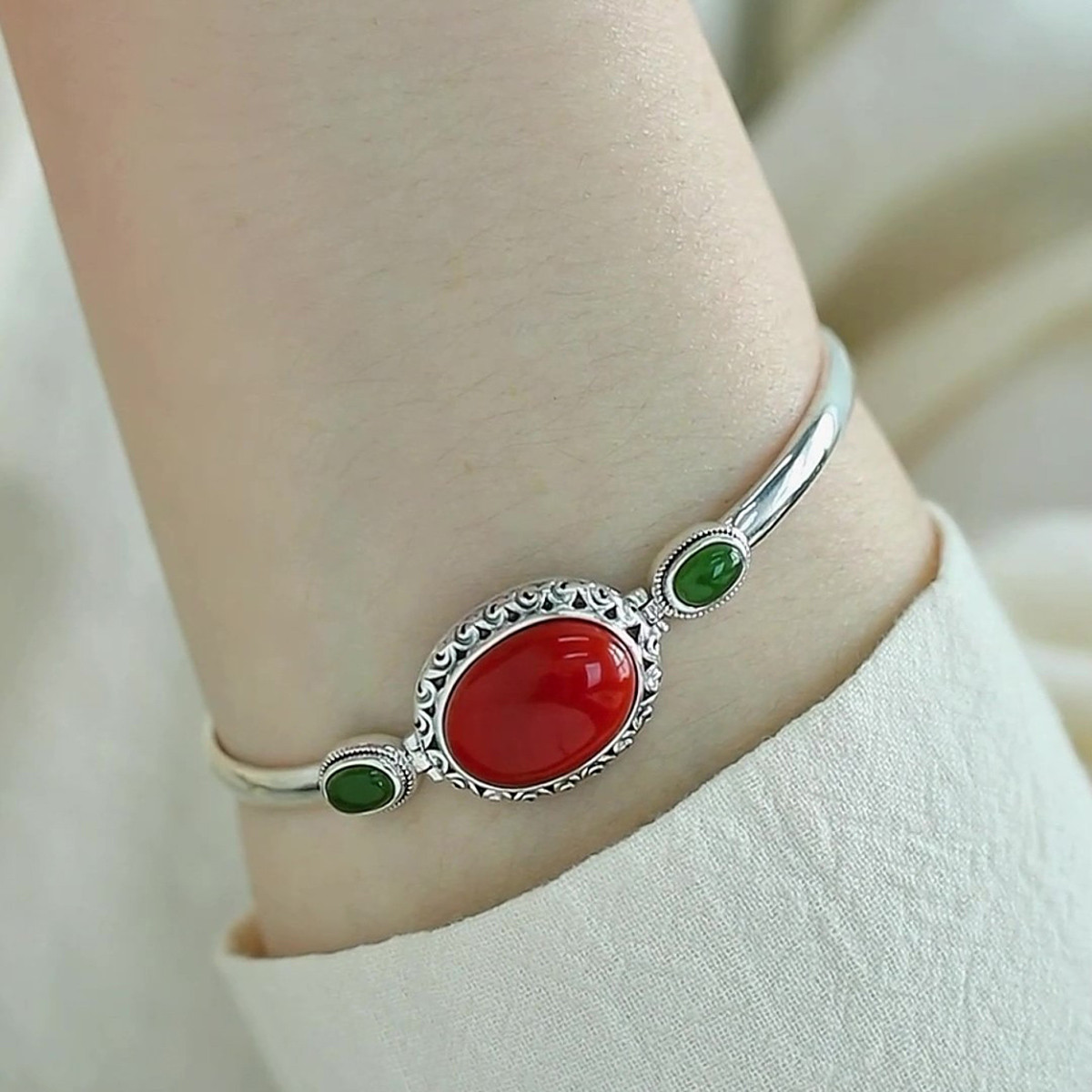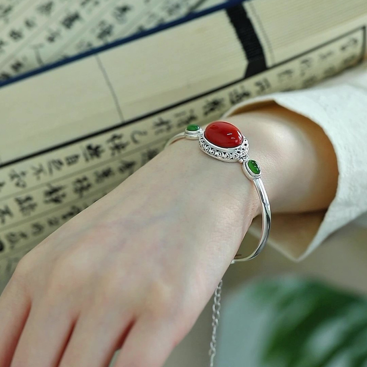 国潮手饰925银女南红玛瑙手链手镯复古气质开口简约百搭国风饰品