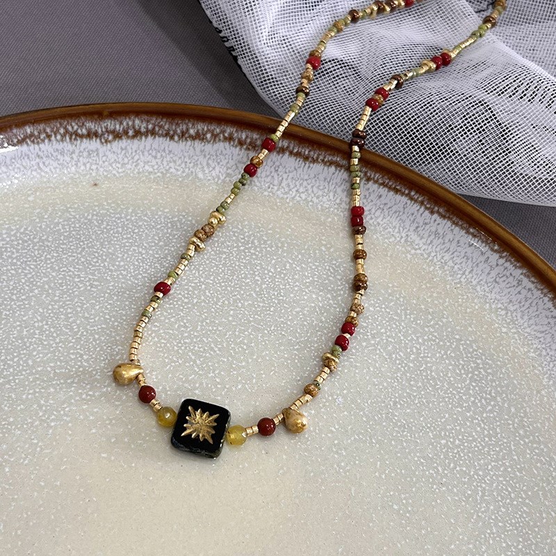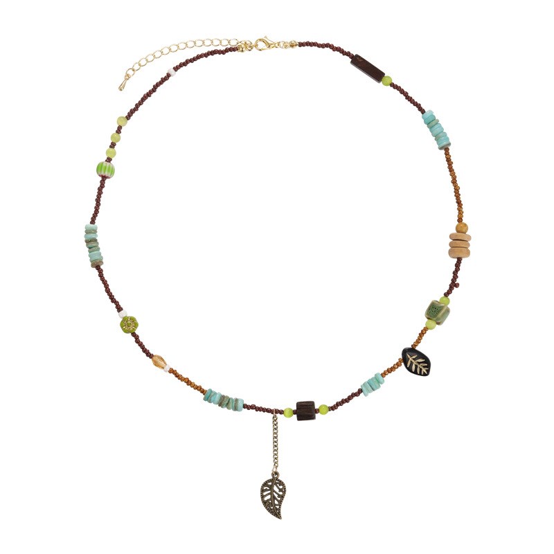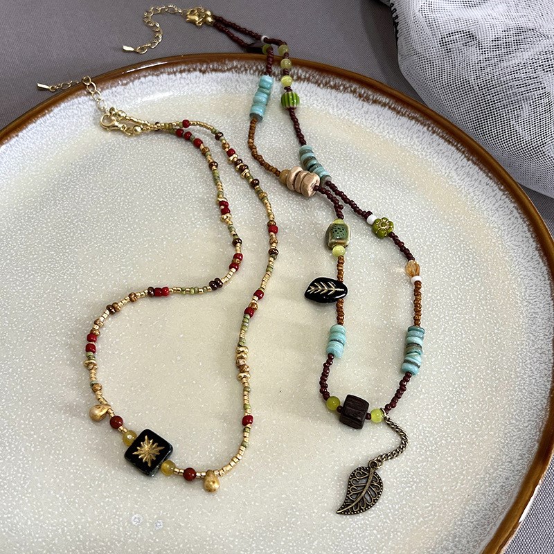 小众设计复古名族风撞色绿色树叶串珠F锁骨链项链国风叠戴颈链配