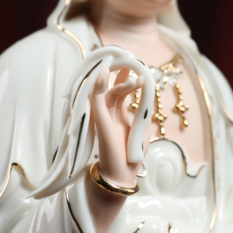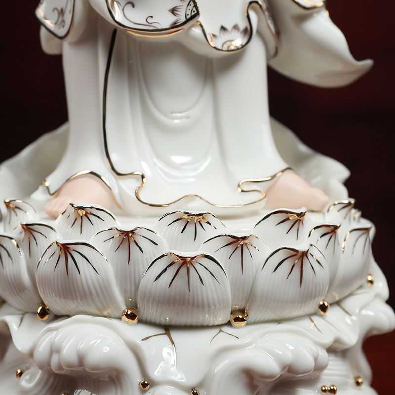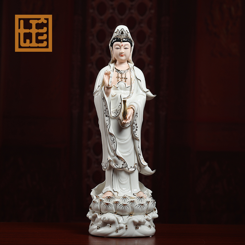 七珍陶瓷描金立莲南海观音菩萨佛像摆件观世音菩萨站立像家用供奉