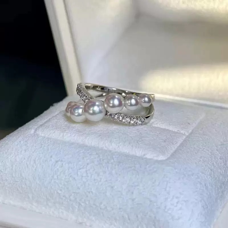 PT950铂金镶嵌D色莫桑石淡水珍珠扭臂交叉排戒纯银温柔百搭精致女