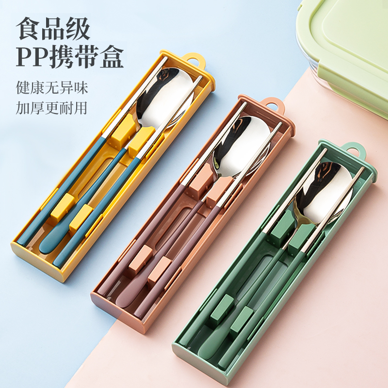 现货速发墨色不锈钢筷子勺子套装便携餐具学生三件套筷子盒可爱叉