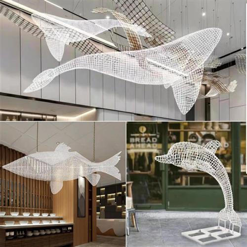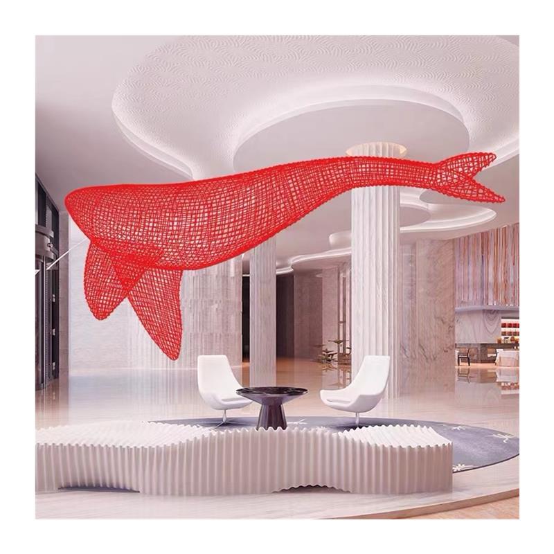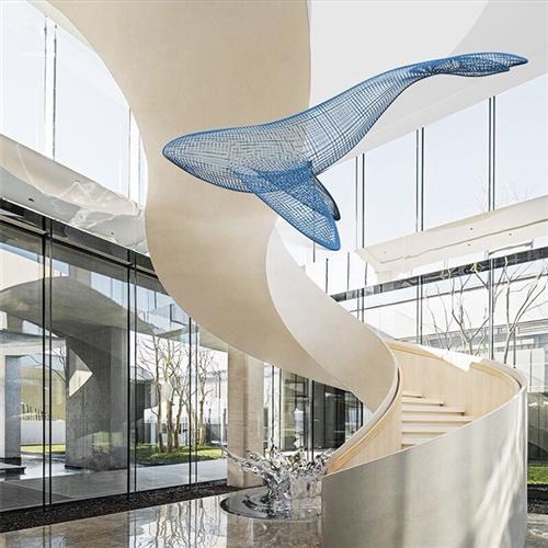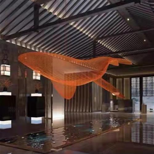 定制大型不锈钢镂空鲸鱼雕塑酒店会场网格编织海洋动物悬挂装饰品