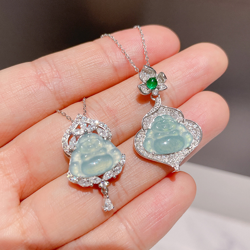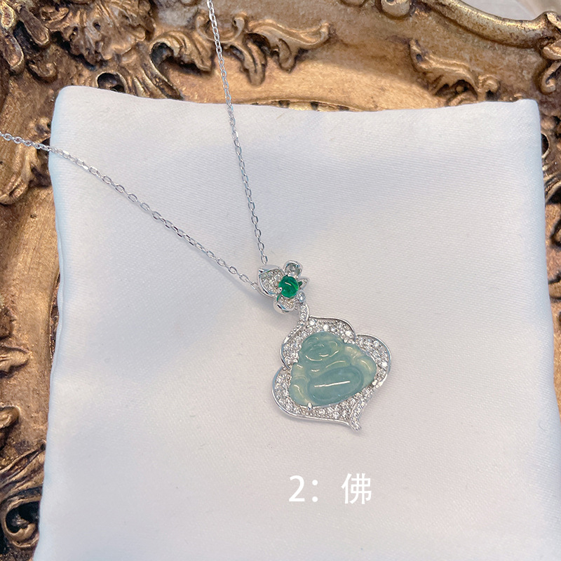 天然翡翠吊坠晴水纯银镶嵌女款A货佛公项链蓝水翡翠锁骨链毛衣链